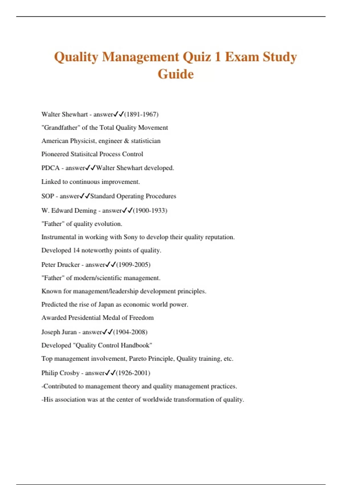 Quality Management Quiz 1 Exam Study Guide Walter Shewhart - answer() "Grandfather" of the Total Quality Movement American Physicist, engineer & statistician Pioneered Statisitcal Process Control PDCA - answerWalter Shewhart developed. Linked to continuous improvement. SOP - answerStandard Operating Procedures W. Edward Deming - answer() "Father" of quality evolution. Instrumental in working with Sony to develop their quality reputation. Developed 14 noteworthy points of quality. Peter Drucker - answer() "Father" of modern/scientific management. Known for management/leadership development principles. Predicted the rise of Japan as economic world power. Awarded Presidential Medal of Freedom Joseph Juran - answer() Developed "Quality Control Handbook" Top management involvement, Pareto Principle, Quality training, etc. Philip Crosby - answer() -Contributed to management theory and quality management practices. -His association was at the center of worldwide transformation of quality. -"Do it right the first time" - Developed Quality Management Maturity Grid -Zero defects program at Martin Company -Author: quality is free Dr. Yoji Akao - answer-Co-developer of Quality Function Deplyment (QFD) Institute. -Received Deming prize -Worked with Hoslin Kanri on strategic planning methodology -helped initiate problem solving technique with "Fishbone Diagram" -Author of many books Hoslin Kanri - answerWorked with Drs Akao and Mizuno on strategic planning methodology. Dr. Shigeru Mizuno - answerCo-developer of Quality Function Deplyment (QFD) Institute. Worked with Hoslin Kanri on strategic planning methodology -helped initiate problem solving technique with "Fishbone Diagram" -Author of many books Strategic Planning - answerContinuous improvement process to do much better. "Do it right the first time" - answerPhilip Crosby Idea Kaoru Ishikawa - answer() Professor -One of Deming's colleagues -Pioneered "cause & Effect" Fishbone diagram -Root Cause analysis -Showed importance of 7 quality tools Fishbone Diagram - answerIshikawa Cause & Effect Diagram Used to ID multiple causes of a single result. Excellent tool for PDCA Genichi Taguchi - answer() Director of two quality entities.