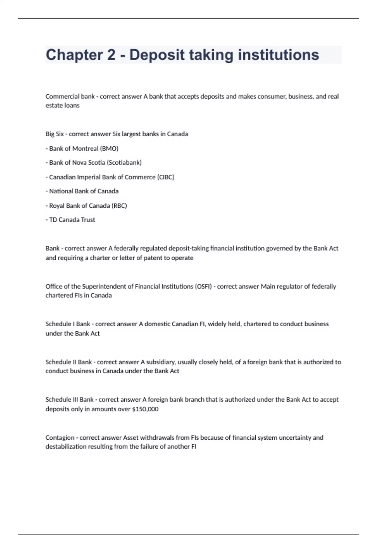 Chapter 2 - Deposit Taking Institutions Practice Review Exam. Commercial bank - correct answer A bank that accepts deposits and makes consumer, business, and real estate loans Big Six - correct answer Six largest banks in Canada - Bank of Montreal (BMO) - Bank of Nova Scotia (Scotiabank) - Canadian Imperial Bank of Commerce (CIBC) - National Bank of Canada - Royal Bank of Canada (RBC) - TD Canada Trust Bank - correct answer A federally regulated deposit-taking financial institution governed by the Bank Act and requiring a charter or letter of patent to operate Office of the Superintendent of Financial Institutions (OSFI) - correct answer Main regulator of federally chartered FIs in Canada Schedule I Bank - correct answer A domestic Canadian FI, widely held, chartered to conduct business under the Bank Act Schedule II Bank - correct answer A subsidiary, usually closely held, of a foreign bank that is authorized to conduct business in Canada under the Bank Act Schedule III Bank - correct answer A foreign bank branch that is authorized under the Bank Act to accept deposits only in amounts over $150,000 Contagion - correct answer Asset withdrawals from FIs because of financial system uncertainty and destabilization resulting from the failure of another FI