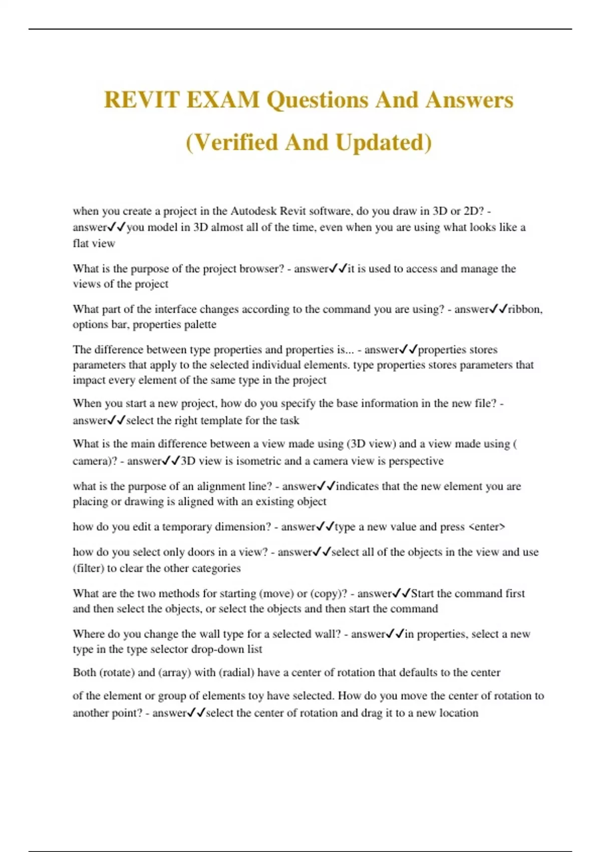 REVIT EXAM Questions And Answers (Verified And Updated) when you create a project in the Autodesk Revit software, do you draw in 3D or 2D? - answeryou model in 3D almost all of the time, even when you are using what looks like a flat view What is the purpose of the project browser? - answerit is used to access and manage the views of the project What part of the interface changes according to the command you are using? - answerribbon, options bar, properties palette The difference between type properties and properties is... - answerproperties stores parameters that apply to the selected individual elements. type properties stores parameters that impact every element of the same type in the project When you start a new project, how do you specify the base information in the new file? - answerselect the right template for the task What is the main difference between a view made using (3D view) and a view made using ( camera)? - answer3D view is isometric and a camera view is perspective what is the purpose of an alignment line? - answerindicates that the new element you are placing or drawing is aligned with an existing object how do you edit a temporary dimension? - answertype a new value and press <enter> how do you select only doors in a view? - answerselect all of the objects in the view and use (filter) to clear the other categories What are the two methods for starting (move) or (copy)? - answerStart the command first and then select the objects, or select the objects and then start the command Where do you change the wall type for a selected wall? - answerin properties, select a new type in the type selector drop-down list Both (rotate) and (array) with (radial) have a center of rotation that defaults to the center of the element or group of elements toy have selected. How do you move the center of rotation to another point? - answerselect the center of rotation and drag it to a new location