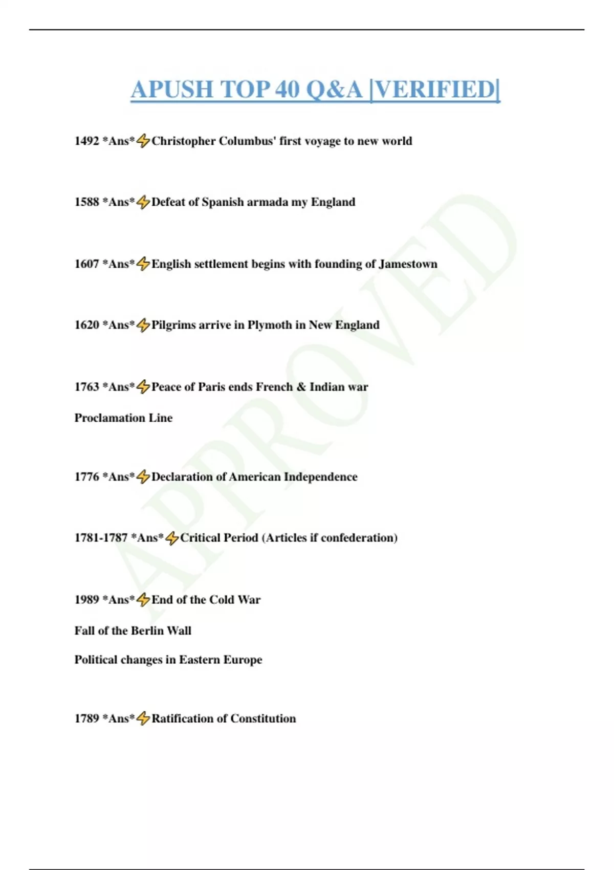 APUSH TOP 40 Q&A |VERIFIED| 1492 *Ans* Christopher Columbus' first voyage to new world 1588 *Ans* Defeat of Spanish armada my England 1607 *Ans* English settlement begins with founding of Jamestown 1620 *Ans* Pilgrims arrive in Plymoth in New England 1763 *Ans* Peace of Paris ends French & Indian war Proclamation Line 1776 *Ans* Declaration of American Independence *Ans* Critical Period (Articles if confederation) 1989 *Ans* End of the Cold War Fall of the Berlin Wall Political changes in Eastern Europe 1789 *Ans* Ratification of Constitution New Government established 1800 *Ans* Election of Thomas Jefferson Transfer of power to new political party 1803 *Ans* Jefferson buys Louisiana from France 1828 *Ans* Election of Andrew Jackson 1838 *Ans* Trail of tears (Cherokee Indian Removal) 1845 *Ans* "Manifest Destiny" Reaches its