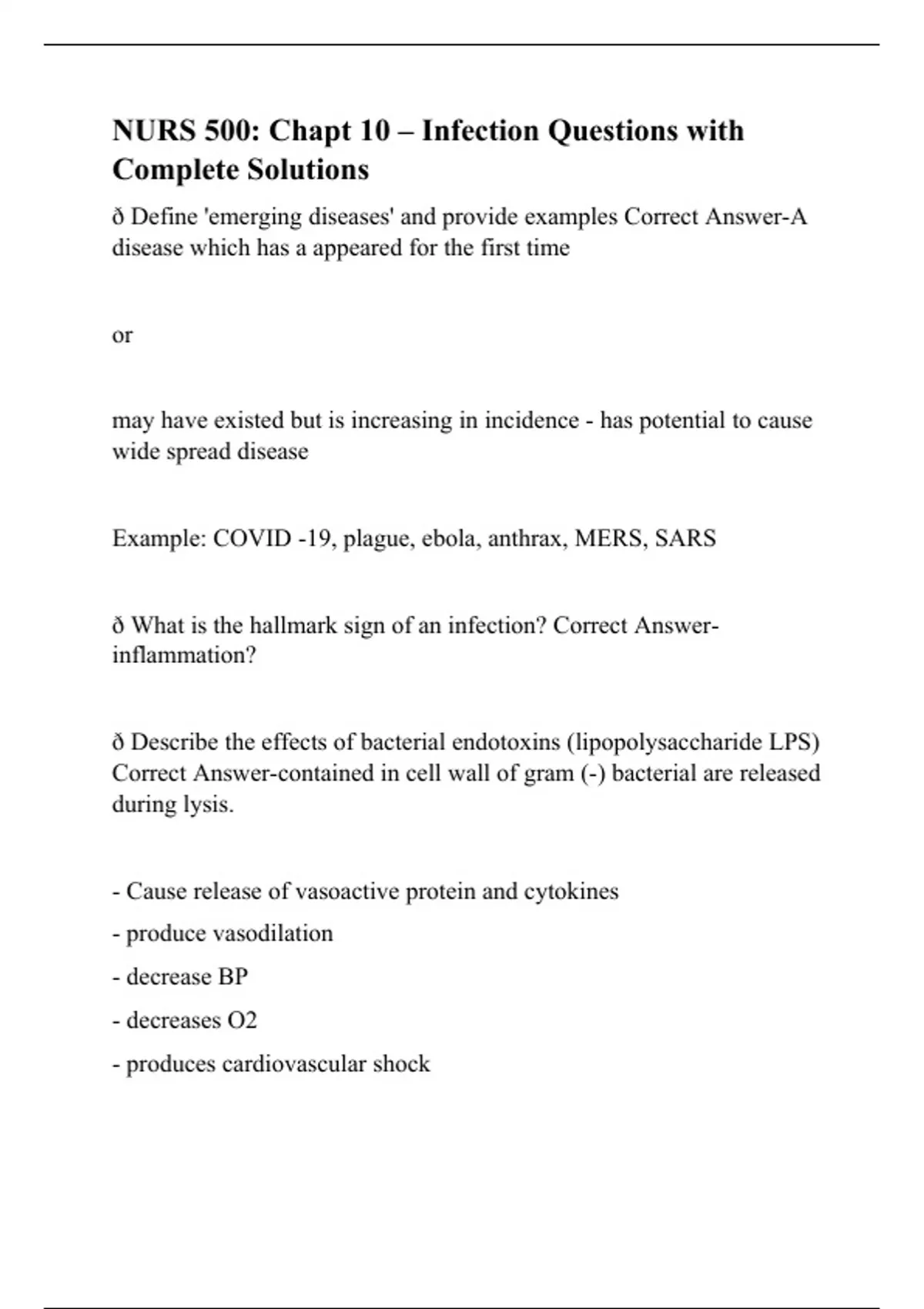ð Define 'emerging diseases' and provide examples Correct Answer-A disease which has a appeared for the first time or may have existed but is increasing in incidence - has potential to cause wide spread disease Example: COVID -19, plague, ebola, anthrax, MERS, SARS ð What is the hallmark sign of an infection? Correct Answer-inflammation? ð Describe the effects of bacterial endotoxins (lipopolysaccharide LPS) Correct Answer-contained in cell wall of gram (-) bacterial are released during lysis. - Cause release of vasoactive protein and cytokines - produce vasodilation - decrease BP - decreases O2 - produces cardiovascular shock