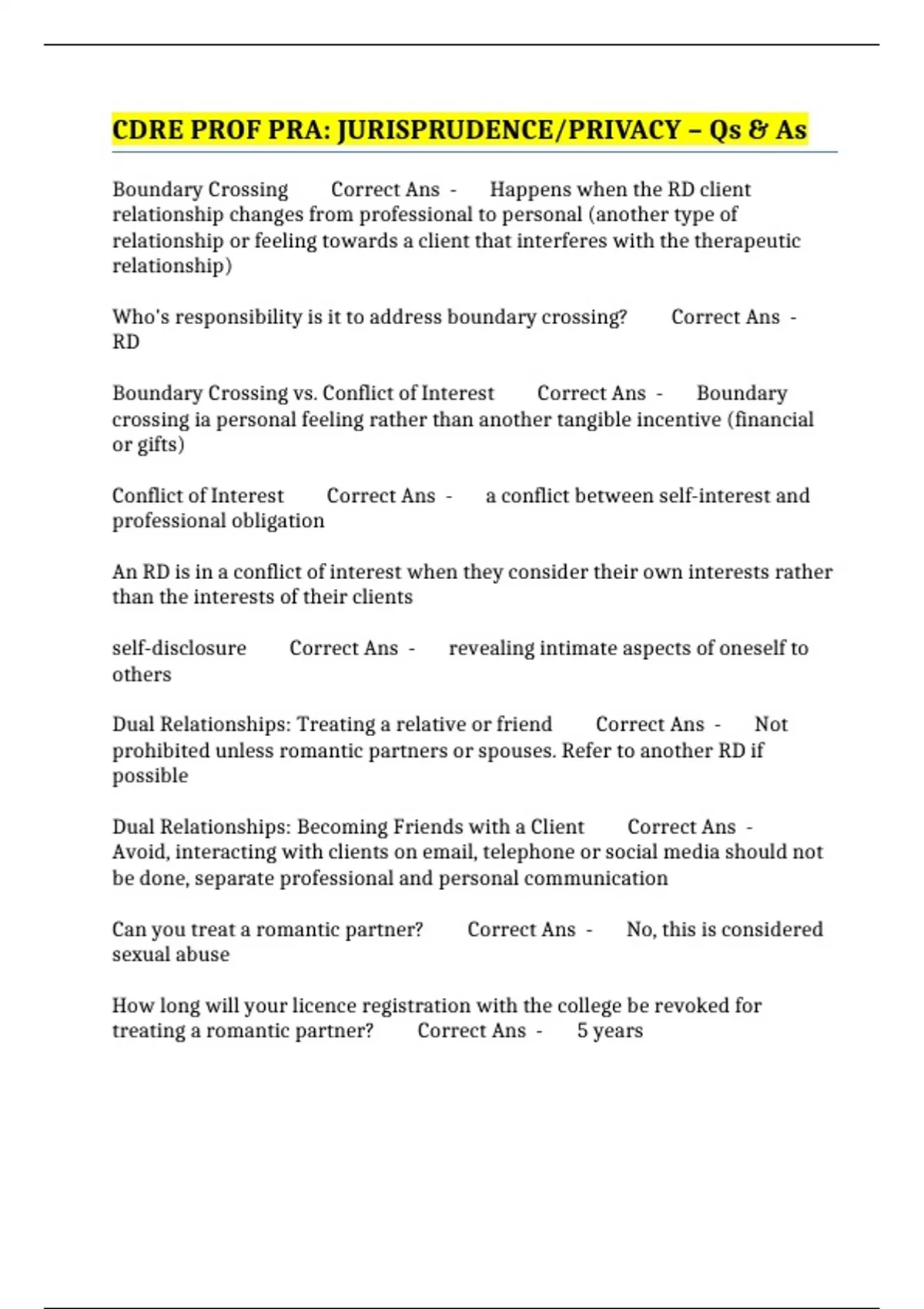 CDRE PROF PRA: JURISPRUDENCE/PRIVACY – Qs & As