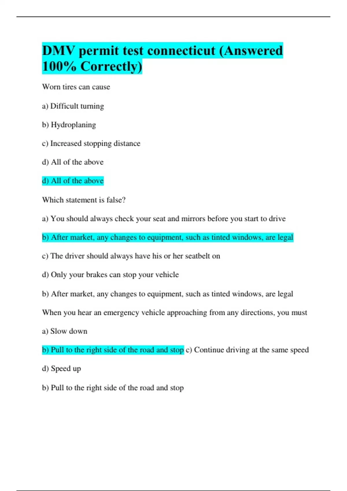 DMV permit test connecticut (Answered 100% Correctly) Worn tires can cause a) Difficult turning b) Hydroplaning c) Increased stopping distance d) All of the above d) All of the above Which statement is false? a) You should always check your seat and mirrors before you start to drive b) After market, any changes to equipment, such as tinted windows, are legal c) The driver should always have his or her seatbelt on d) Only your brakes can stop your vehicle b) After market, any changes to equipment, such as tinted windows, are legal When you hear an emergency vehicle approaching from any directions, you must a) Slow down b) Pull to the right side of the road and stop c) Continue driving at the same speed d) Speed up b) Pull to the right side of the road and stop The No-Zone area is a) An area where pedestrians cannot cross the street b) An area where vehicles are not allowed to park c) The danger areas around a truck where there are blind spots for the driver d) None of the above c) The danger areas around a truck where there are blind spots for the driver At a four way stop