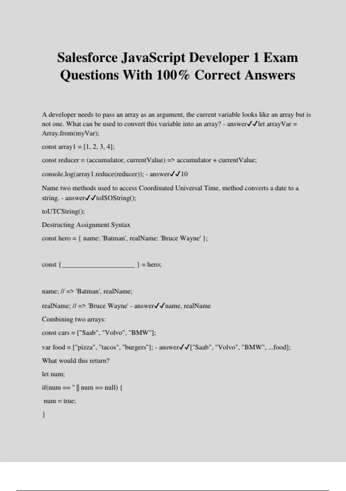 Salesforce JavaScript Developer 1 Exam Questions With 100% Correct Answers A developer needs to pass an array as an argument, the current variable looks like an array but is not one. What can be used to convert this variable into an array? - answerlet arrayVar = A(myVar); const array1 = [1, 2, 3, 4]; const reducer = (accumulator, currentValue) => accumulator + currentValue; (e(reducer)); - answer10 Name two methods used to access Coordinated Universal Time, method converts a date to a string. - answertoISOString(); toUTCString(); Destructing Assignment Syntax const hero = { name: 'Batman', realName: 'Bruce Wayne' }; const {_____________________ } = hero; name; // => 'Batman', realName; realName; // => 'Bruce Wayne' - answername, realName Combining two arrays: const cars = ["Saab", "Volvo", "BMW"]; var food = ["pizza", "tacos", "burgers"]; - answer["Saab", "Volvo", "BMW", ...food]; What would this return? let num; if(num == '' || num == null) { num = true; } return num; - answertrue let fake; ((fake == 0)); //false ((fake == null)) // true What would this return? let count = null; if(count == undefined && count== null) { count = true; } return count; - answertrue So: undefined == null What would this return? let count = null; if(count == "" && count== null) { count = true; } return count; - answernull let fruit = [{type: 'Apple', price: 1.99, quantity: 3}, {type: 'Pear', price: 2.59, quantity: 2} ]; const cost = e((accumulator, currentValue) => {return(accumulator + currentV *currentVity)}, 0); - answer11.15 (correct total) What is the symbol data type? - answerSymbol is a built-in object whose constructor returns a symbol primitive — also called a Symbol value or just a Symbol — that's guaranteed to be unique. Symbols are often used to add unique property keys to an object that won't collide with keys any other code might add to the object, and which are hidden from any mechanisms other code will typically use to access the object. That enables a form of weak encapsulation, or a weak form of information hiding.