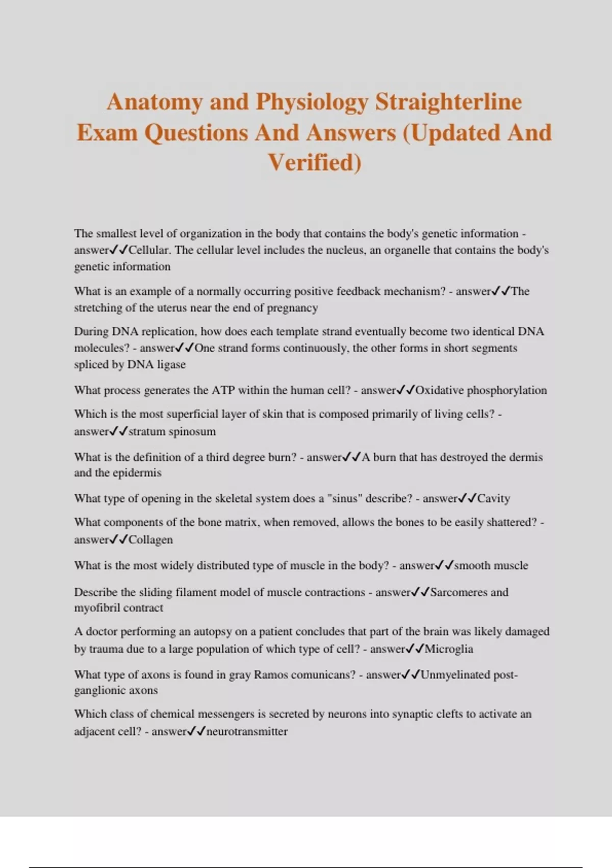 Anatomy and Physiology Straighterline Exam Questions And Answers (Updated And Verified) The smallest level of organization in the body that contains the body's genetic information - answerCellular. The cellular level includes the nucleus, an organelle that contains the body's genetic information What is an example of a normally occurring positive feedback mechanism? - answerThe stretching of the uterus near the end of pregnancy During DNA replication, how does each template strand eventually become two identical DNA molecules? - answerOne strand forms continuously, the other forms in short segments spliced by DNA ligase What process generates the ATP within the human cell? - answerOxidative phosphorylation Which is the most superficial layer of skin that is composed primarily of living cells? - answerstratum spinosum What is the definition of a third degree burn? - answerA burn that has destroyed the dermis and the epidermis What type of opening in the skeletal system does a "sinus" describe? - answerCavity What components of the bone matrix, when removed, allows the bones to be easily shattered? - answerCollagen What is the most widely distributed type of muscle in the body? - answersmooth muscle Describe the sliding filament model of muscle contractions - answerSarcomeres and myofibril contract A doctor performing an autopsy on a patient concludes that part of the brain was likely damaged by trauma due to a large population of which type of cell? - answerMicroglia What type of axons is found in gray Ramos comunicans? - answerUnmyelinated post- ganglionic axons Which class of chemical messengers is secreted by neurons into synaptic clefts to activate an adjacent cell? - answerneurotransmitter