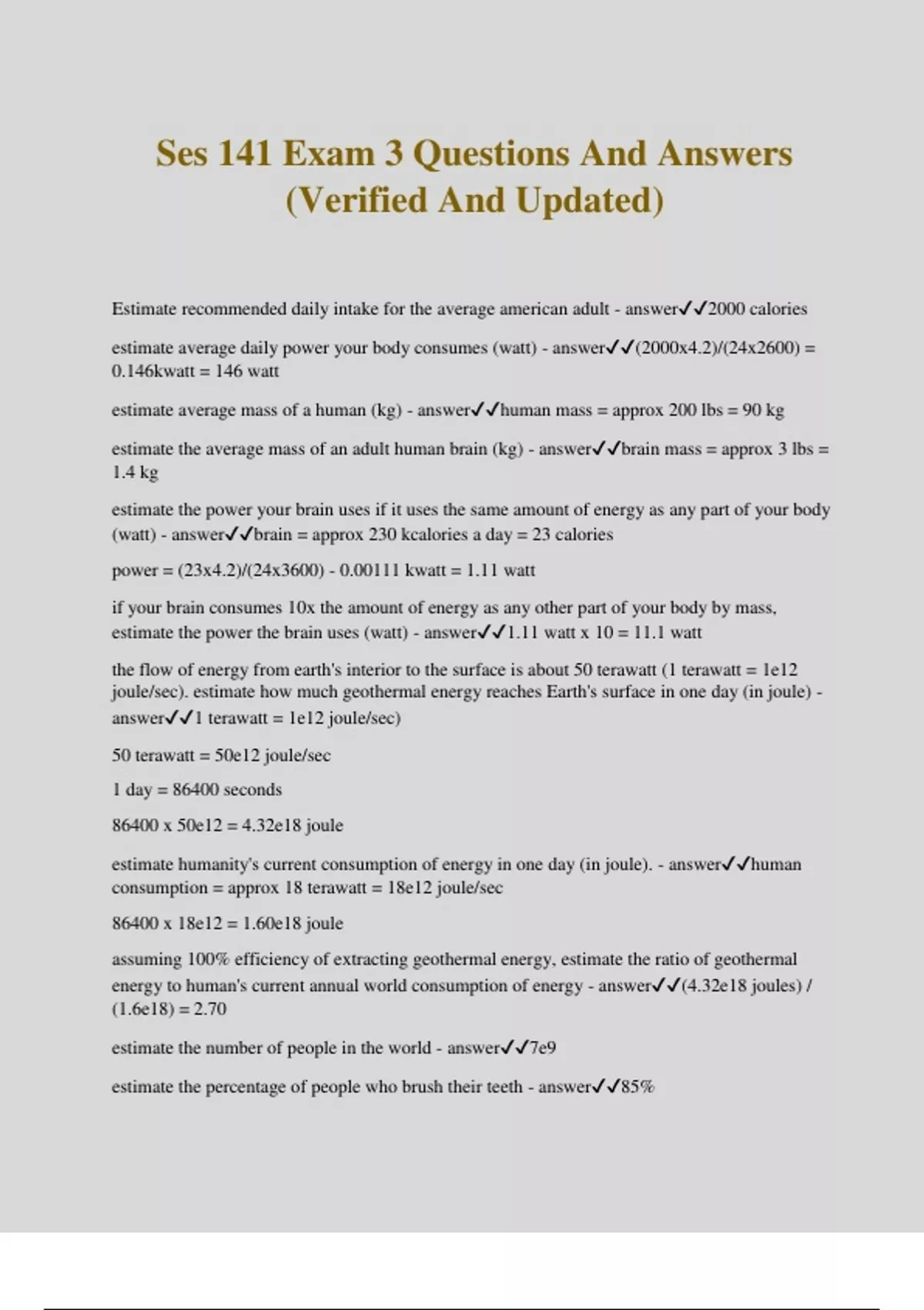 Ses 141 Exam 3 Questions And Answers (Verified And Updated) Estimate recommended daily intake for the average american adult - answer2000 calories estimate average daily power your body consumes (watt) - answer(2000x4.2)/(24x2600) = 0.146kwatt = 146 watt estimate average mass of a human (kg) - answerhuman mass = approx 200 lbs = 90 kg estimate the average mass of an adult human brain (kg) - answerbrain mass = approx 3 lbs = 1.4 kg estimate the power your brain uses if it uses the same amount of energy as any part of your body (watt) - answerbrain = approx 230 kcalories a day = 23 calories power = (23x4.2)/(24x3600) - 0.00111 kwatt = 1.11 watt if your brain consumes 10x the amount of energy as any other part of your body by mass, estimate the power the brain uses (watt) - answer1.11 watt x 10 = 11.1 watt the flow of energy from earth's interior to the surface is about 50 terawatt (1 terawatt = 1e12 joule/sec). estimate how much geothermal energy reaches Earth's surface in one day (in joule) - answer1 terawatt = 1e12 joule/sec) 50 terawatt = 50e12 joule/sec 1 day = 86400 seconds 86400 x 50e12 = 4.32e18 joule estimate humanity's current consumption of energy in one day (in joule). - answerhuman consumption = approx 18 terawatt = 18e12 joule/sec 86400 x 18e12 = 1.60e18 joule assuming 100% efficiency of extracting geothermal energy, estimate the ratio of geothermal energy to human's current annual world consumption of energy - answer(4.32e18 joules) / (1.6e18) = 2.70 estimate the number of people in the world - answer7e9 estimate the percentage of people who brush their teeth - answer85%