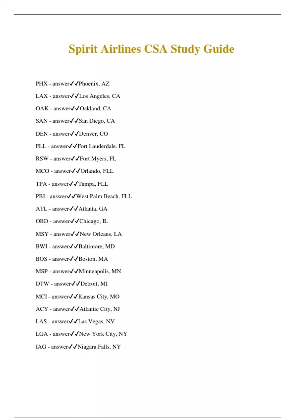 Spirit Airlines CSA Study Guide PHX - answerPhoenix, AZ LAX - answerLos Angeles, CA OAK - answerOakland, CA SAN - answerSan Diego, CA DEN - answerDenver, CO FLL - answerFort Lauderdale, FL RSW - answerFort Myers, FL MCO - answerOrlando, FLL TPA - answerTampa, FLL PBI - answerWest Palm Beach, FLL ATL - answerAtlanta, GA ORD - answerChicago, IL MSY - answerNew Orleans, LA BWI - answerBaltimore, MD BOS - answerBoston, MA MSP - answerMinneapolis, MN DTW - answerDetroit, MI MCI - answerKansas City, MO ACY - answerAtlantic City, NJ LAS - answerLas Vegas, NV LGA - answerNew York City, NY IAG - answerNiagara Falls, NY