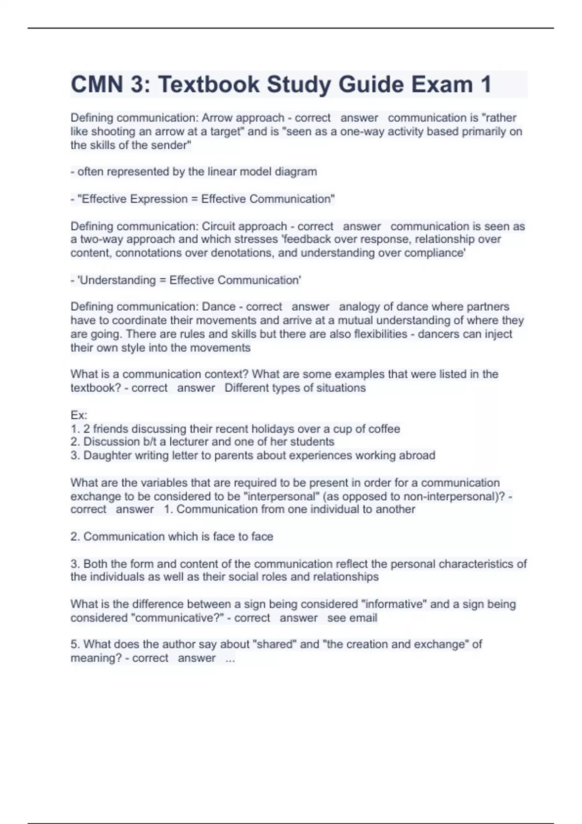 CMN 3: Textbook Study Guide Exam 1 Questions And Answers.Defining communication: Arrow approach - correct answer communication is "rather like shooting an arrow at a target" and is "seen as a one-way activity based primarily on the skills of the sender" - often represented by the linear model diagram - "Effective Expression = Effective Communication" Defining communication: Circuit approach - correct answer communication is seen as a two-way approach and which stresses 'feedback over response, relationship over content, connotations over denotations, and understanding over compliance' - 'Understanding = Effective Communication' Defining communication: Dance - correct answer analogy of dance where partners have to coordinate their movements and arrive at a mutual understanding of where they are going. There are rules and skills but there are also flexibilities - dancers can inject their own style into the movements What is a communication context? What are some examples that were listed in the textbook? - correct answer Different types of situations Ex: 1. 2 friends discussing their recent holidays over a cup of coffee 2. Discussion b/t a lecturer and one of her students 3. Daughter writing letter to parents about experiences working abroad What are the variables that are required to be present in order for a communication exchange to be considered to be "interpersonal" (as opposed to non-interpersonal)? - correct answer 1. Communication from one individual to another 2. Communication which is face to face 3. Both the form and content of the communication reflect the personal characteristics of the individuals as well as their social roles and relationships What is the difference between a sign being considered "informative" and a sign being considered "communicative?" - correct answer see email 5. What does the author say about "shared" and "the creation and exchange" of meaning? - correct answer ...