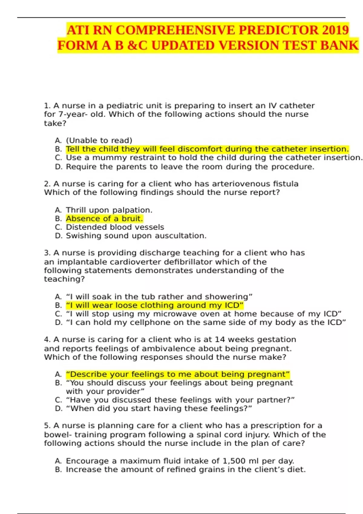 ATI RN COMPREHENSIVE PREDICTOR 2019 FORM A B &C UPDATED VERSION TEST BANK 1. A nurse in a pediatric unit is preparing to insert an IV catheter for 7-year- old. Which of the following actions should the nurse take? A. (Unable to read) B. Tell the child they will feel discomfort during the catheter insertion. C. Use a mummy restraint to hold the child during the catheter insertion. D. Require the parents to leave the room during the procedure. 2. A nurse is caring for a client who has arteriovenous fistula Which of the following findings should the nurse report? A. Thrill upon palpation. B. Absence of a bruit. C. Distended blood vessels D. Swishing sound upon auscultation. 3. A nurse is providing discharge teaching for a client who has an implantable cardioverter defibrillator which of the following statements demonstrates understanding of the teaching? A. “I will soak in the tub rather and showering” B. “I will wear loose clothing around my ICD” C. “I will stop using my microwave oven at home because of my ICD” D. “I can hold my cellphone on the same side of my body as the ICD” 4. A nurse is caring for a client who is at 14 weeks gestation and reports feelings of ambivalence about being pregnant. Which of the following responses should the nurse make? A. “Describe your feelings to me about being pregnant” B. “You should discuss your feelings about being pregnant with your provider” C. “Have you discussed these feelings with your partner?” D. “When did you start having these feelings?” 5. A nurse is planning care for a client who has a prescription for a bowel- training program following a spinal cord injury. Which of the following actions should the nurse include in the plan of care? A. Encourage a maximum fluid intake of 1,500 ml per day. B. Increase the amount of refined grains in the client’s diet. C. Provide the client with a cold drink prior to defecation. D. Administer a rectal suppository 30 minutes prior to scheduled defecation times. 6. A nurse is caring for a client who is in active labor and requests pain management. Which of the following actions should the nurse take? A. Administer ondansetron. B. Place the client in a warm shower. C. Apply fundal pressure during contractions. D. Assist the client to a supine position. 7. a nurse in an emergency department is performing triage for multiple clients following a disaster in the community. To which of the following types of injuries should the nurse assign the highest priority? A. Below-the knee amputation B. Fractured tibia C. 95% full-thickness body burn D. 10cm (4in) laceration to the forearm 8. a nurse manager is updating protocols for the use of belt restraints. Which of the following guidelines should the nurse include? A. Remove the client’s restraint every 4hr B. Document the client’s condition every 15 min C. Attach the restrain to the bed’s side rails D. Request a PRN restrain prescription for clients who are aggressive 9. A nurse is teaching an in-service about nursing leadership. Which of the following information should the nurse include about an effective leader? A. Acts as an advocate for the nursing unit. B. (Unable to read) for the unit C. Priorities staff request over client needs. D. Provides routine client care and documentation. 10. A nurse is reviewing the laboratory findings of a client who has diabetes mellitus and reports that she has been following her (unable to read) care. The nurse should identify which of the following findings indicates a need to revise the client’s plan of care. A. Serum sodium 144 mEq/ B. (Unable to read) C. Hba1c 10 % D. Random serum glucose 190 mg/dl. 11. A nurse in a provider’s office is reviewing the laboratory results of a group of clients. The nurse should identify that which of the following sexually transmitted infections is a nationally notifiable infectious disease that should be reported to the state health department? A. Chlamydia B. Human papillomavirus C. Candidiasis D. Herps simplex virus 12. A nurse is teaching a newly licensed nurse about therapeutic techniques to use when leading a group on a mental health unit. Which of the following group facilitation techniques should the nurse include in the teaching? A. Share personal opinions to help influence the group’s values B. Measure the accomplishments of the group against a previous group C. Yield in situations of conflicts to maintain group harmony D. Use modeling to help the clients improve their interpersonal skills 13. A nurse is planning for a client who practices Orthodox Judaism. The client tells the nurse that (Unable to read) Passover holiday. Which of the following action should the nurse include in the plan of care? A. Provide chicken with cream sauce. B. Avoid serving fish with fins and scales. C. Provide unleavened bread. D. Avoid serving foods containing lamb. 14. A nurse is caring for a client who has a pulmonary embolism. The nurse should identify the effectiveness of the treatment A. A chest x-ray reveals increased density in all fields. B. The client reports feeling less anxious. C. Diminished breath sounds are auscultated bilaterally D. ABG results include Ph 7.48 PaO2 77 mm Hg and PaCO2 47 mm Hg. 15. A nurse in an emergency department is assessing a client who reports ingesting thirty diazepam tablets (Unable to read) a respiratory rate of 10/min. After securing the client’s airway and initiating an IV, which of the following actions should the nurse do next. A. Monitor the client’s IV site for thrombophlebitis.