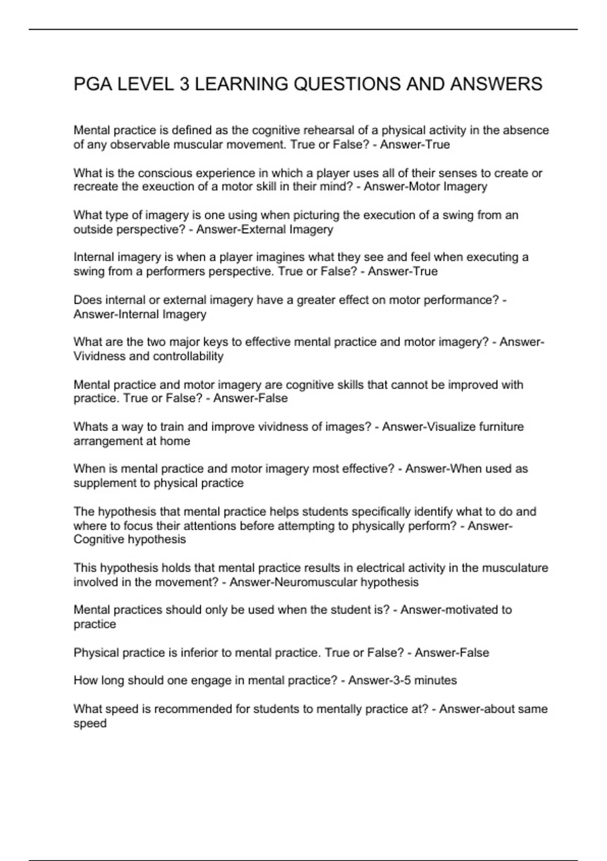Mental practice is defined as the cognitive rehearsal of a physical activity in the absence of any observable muscular movement. True or False? - Answer-True What is the conscious experience in which a player uses all of their senses to create or recreate the exeuction of a motor skill in their mind? - Answer-Motor Imagery What type of imagery is one using when picturing the execution of a swing from an outside perspective? - Answer-External Imagery Internal imagery is when a player imagines what they see and feel when executing a swing from a performers perspective. True or False? - Answer-True Does internal or external imagery have a greater effect on motor performance? - Answer-Internal Imagery What are the two major keys to effective mental practice and motor imagery? - Answer-Vividness and controllability Mental practice and motor imagery are cognitive skills that cannot be improved with practice. True or False? - Answer-False Whats a way to train and improve vividness of images? - Answer-Visualize furniture arrangement at home When is mental practice and motor imagery most effective? - Answer-When used as supplement to physical practice The hypothesis that mental practice helps students specifically identify what to do and where to focus their attentions before attempting to physically perform? - Answer-Cognitive hypothesis This hypothesis holds that mental practice results in electrical activity in the musculature involved in the movement? - Answer-Neuromuscular hypothesis Mental practices should only be used when the student is? - Answer-motivated to practice
