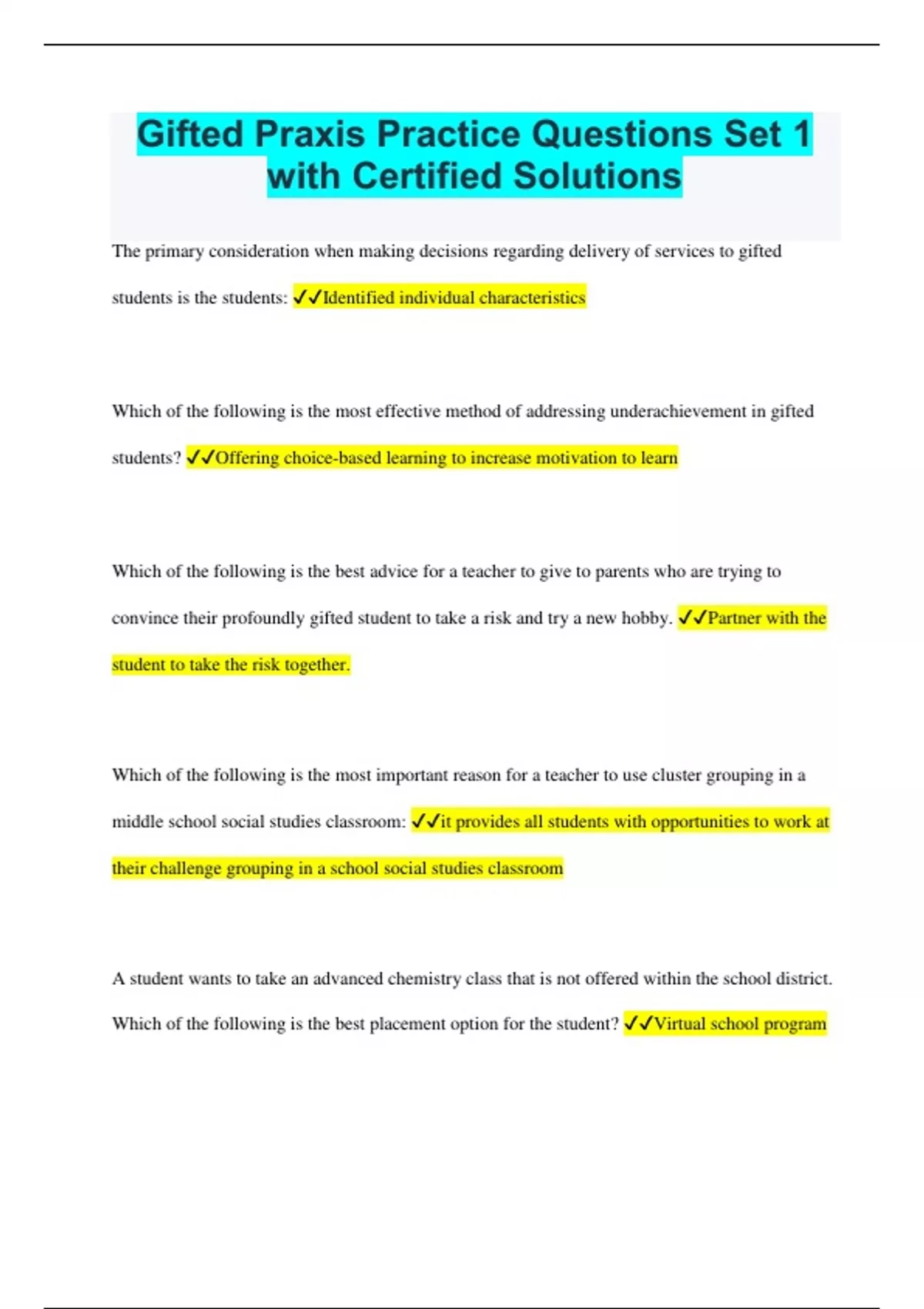 Gifted Praxis Practice Questions Set 1 with Certified Solutions The primary consideration when making decisions regarding delivery of services to gifted students is the students: Identified individual characteristics Which of the following is the most effective method of addressing underachievement in gifted students? Offering choice-based learning to increase motivation to learn Which of the following is the best advice for a teacher to give to parents who are trying to convince their profoundly gifted student to take a risk and try a new hobby. Partner with the student to take the risk together. Which of the following is the most important reason for a teacher to use cluster grouping in a middle school social studies classroom: it provides all students with opportunities to work at their challenge grouping in a school social studies classroom A student wants to take an advanced chemistry class that is not offered within the school district. Which of the following is the best placement option for the student? Virtual school program The results of a skills assessment indicate that a third-grade gifted student who struggles frequently in reading class has dyslexia. It is most appropriate for the teacher of the gifted student to address the limitation by: providing the student with more processing time to complete assignments Which of the following is a primary reason for a teacher to use a portfolio as an assessment instrument for gifted identification? To demonstrate student learning through a product An essential characteristic of giftedness is seen in a toddler who has rapid language development A student has been identified as gifted and as having an autism spectrum disorder and difficulties with fine-motor coordination. Which of the following instructional adjustments is most appropriate for the student? Allowing the student to complete all written responses in print for ease and consistency Gifted students can monitor their performance levels during a unit by self-assessming their understanding with a rubric describing criteria for success Of