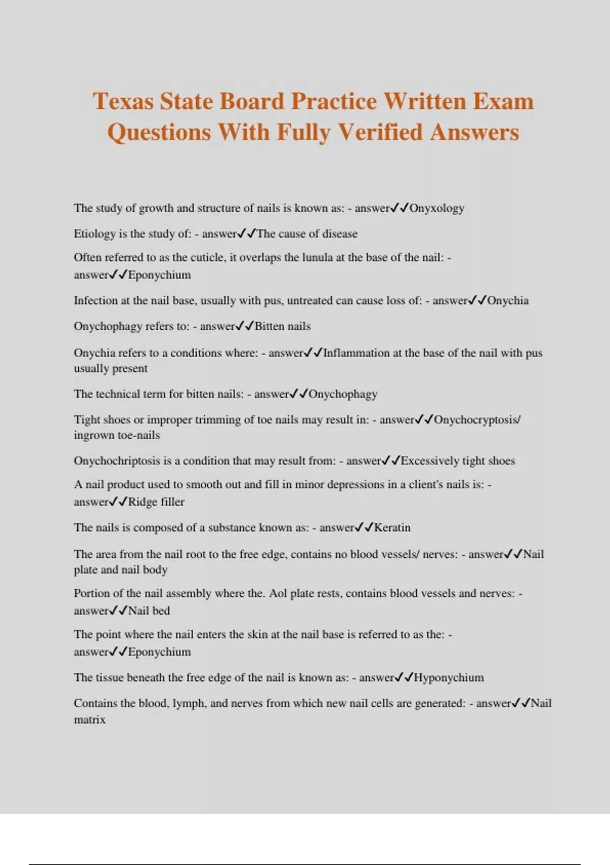Texas State Board Practice Written Exam Questions With Fully Verified Answers The study of growth and structure of nails is known as: - answerOnyxology Etiology is the study of: - answerThe cause of disease Often referred to as the cuticle, it overlaps the lunula at the base of the nail: - answerEponychium Infection at the nail base, usually with pus, untreated can cause loss of: - answerOnychia Onychophagy refers to: - answerBitten nails Onychia refers to a conditions where: - answerInflammation at the base of the nail with pus usually present The technical term for bitten nails: - answerOnychophagy Tight shoes or improper trimming of toe nails may result in: - answerOnychocryptosis/ ingrown toe-nails Onychochriptosis is a condition that may result from: - answerExcessively tight shoes A nail product used to smooth out and fill in minor depressions in a client's nails is: - answerRidge filler The nails is composed of a substance known as: - answerKeratin The area from the nail root to the free edge, contains no blood vessels/ nerves: - answerNail plate and nail body Portion of the nail assembly where the. Aol plate rests, contains blood vessels and nerves: - answerNail bed The point where the nail enters the skin at the nail base is referred to as the: - answerEponychium The tissue beneath the free edge of the nail is known as: - answerHyponychium Contains the blood, lymph, and nerves from which new nail cells are generated: - answerNail matrix This is the active tissue from which nail cells are generated: - answerNail matix The nail root and nail matrix are located in this cup/ pocket like structure: - answerNail mantle Leuconychia is a condition that usually presents as: - answerWhite spots/streaks under the nails The Latin/medical term for nails is: - answerOnyx If a finger nail is lost/ removed, approximately how long will it take to grow back? - answer3-6 months If lost/ removed, how long will it take to grow a new nail plate/ nail body - answer3-6 months If a toe nail is lost/ removed how long will it take to grow back? - answer9-18 months If the technician causes bleeding to occur during a nail service, the should use: - answerStyptic powder/ powdered alum Once destroyed, which part of the nail will not grow again? - answerMatrix The adhesive coat for nail polish is the: - answerBase coat Pumice powder is most commonly found in: - answerCuticle cream If bleeding occurs during a manicure/ pedicure, use: - answerAnitseptic Always file natural nails: - answerCorner to center The technical term for a hang nail is: - answerAgnail If artificial nails are lifting from the nail bed, this may cause: - answerMold and infection Cuticle creams will help to prevent: - answerHang-nails/ agnails Onychophagy may increase blood flow to the ______ and cause the nail to grow faster: - answerNail matrix This portion of the nail effects it's shape, size, and rate of growth: - answerMatrix A half-moon at the base of the nail is known as: - answerLunula Oil and moisture under a nail enhancement may cause: - answerEnhancements to lift/ fall off The largest bone in the arm is known as the: - answerHumerous