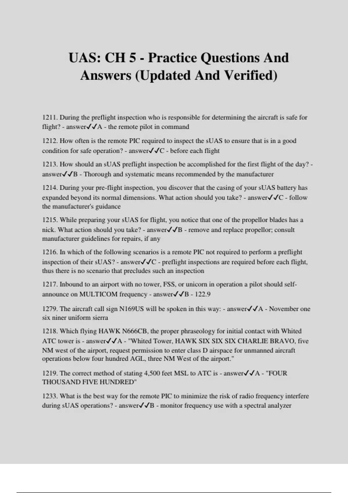 UAS: CH 5 - Practice Questions And Answers (Updated And Verified) 1211. During the preflight inspection who is responsible for determining the aircraft is safe for flight? - answerA - the remote pilot in command 1212. How often is the remote PIC required to inspect the sUAS to ensure that is in a good condition for safe operation? - answerC - before each flight 1213. How should an sUAS preflight inspection be accomplished for the first flight of the day? - answerB - Thorough and systematic means recommended by the manufacturer 1214. During your pre-flight inspection, you discover that the casing of your sUAS battery has expanded beyond its normal dimensions. What action should you take? - answerC - follow the manufacturer's guidance 1215. While preparing your sUAS for flight, you notice that one of the propellor blades has a nick. What action should you take? - answerB - remove and replace propellor; consult manufacturer guidelines for repairs, if any 1216. In which of the following scenarios is a remote PIC not required to perform a preflight inspection of their sUAS? - answerC - preflight inspections are required before each flight, thus there is no scenario that precludes such an inspection 1217. Inbound to an airport with no tower, FSS, or unicorn in operation a pilot should self- announce on MULTICOM frequency - answerB - 122.9 1279. The aircraft call sign N169US will be spoken in this way: - answerA - November one six niner uniform sierra 1218. Which flying HAWK N666CB, the proper phraseology for initial contact with Whited ATC tower is - answerA - "Whited Tower, HAWK SIX SIX SIX CHARLIE BRAVO, five NM west of the airport, request permission to enter class D airspace for unmanned aircraft operations below four hundred AGL, three NM West of the airport." 1219. The correct method of stating 4,500 feet MSL to ATC is - answerA - "FOUR THOUSAND FIVE HUNDRED" 1233. What is the best way for the remote PIC to minimize the risk of radio frequency interfere during sUAS operations? - answerB - monitor frequency use with a spectral analyzer