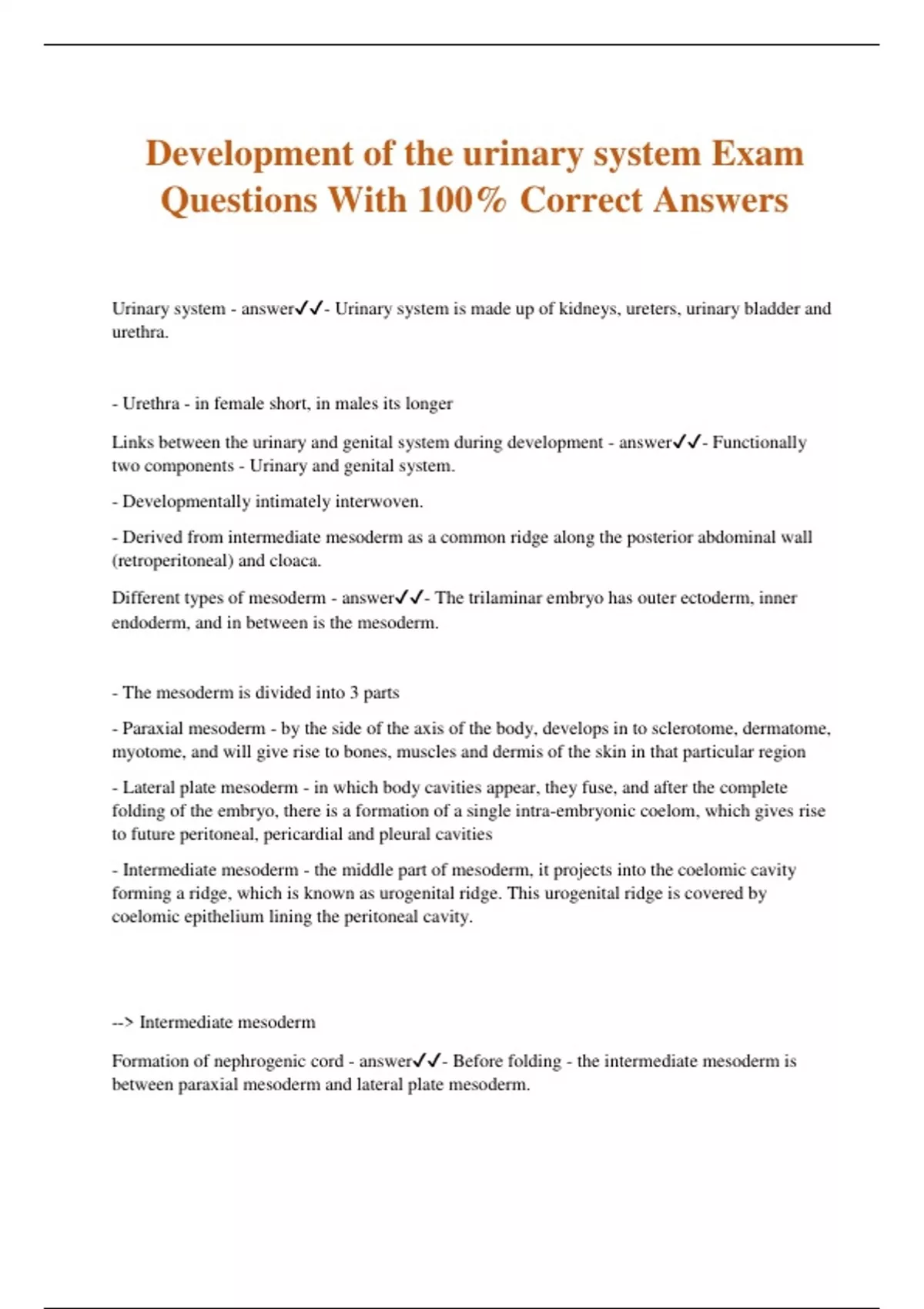 Development of the urinary system Exam Questions With 100% Correct Answers Urinary system - answer- Urinary system is made up of kidneys, ureters, urinary bladder and urethra. - Urethra - in female short, in males its longer Links between the urinary and genital system during development - answer- Functionally two components - Urinary and genital system. - Developmentally intimately interwoven. - Derived from intermediate mesoderm as a common ridge along the posterior abdominal wall (retroperitoneal) and cloaca. Different types of mesoderm - answer- The trilaminar embryo has outer ectoderm, inner endoderm, and in between is the mesoderm. - The mesoderm is divided into 3 parts - Paraxial mesoderm - by the side of the axis of the body, develops in to sclerotome, dermatome, myotome, and will give rise to bones, muscles and dermis of the skin in that particular region - Lateral plate mesoderm - in which body cavities appear, they fuse, and after the complete folding of the embryo, there is a formation of a single intra-embryonic coelom, which gives rise to future peritoneal, pericardial and pleural cavities - Intermediate mesoderm - the middle part of mesoderm, it projects into the coelomic cavity forming a ridge, which is known as urogenital ridge. This urogenital ridge is covered by coelomic epithelium lining the peritoneal cavity. --> Intermediate mesoderm Formation of nephrogenic cord - answer- Before folding - the intermediate mesoderm is between paraxial mesoderm and lateral plate mesoderm. - After folding - it forms the urogenital ridge - Its surface is covered by the epithelium lining the peritoneal cavity (coelomic epithelium). - The urogenital ridge is divided into two parts o medial part - genital ridge - aka gonadal ridge o lateral part - nephrogenic cord - Nephrogenic cord - cervical region to the sacral region of the embryo - Nephrogenic cord is the future site for kidneys - It extends from the neck up to the sacrum Development of kidney - answer- The vertebrate kidney has passed through three stages of evolution - Three sections of the nephrogenic cord: - Pronephros - most primitive, In cervical region, disappears - This develops the duct system and pronephric duct and both will disappear - Mesonephros - functioning kidney of most anamniotes - Thoracolumbar region - In humans - only duct system persists which develop into male genital ducts - It has its own duct known as the mesonephric duct - The mesonephros will disappear, but the mesonephric duct will not - it persists in humans and will develop into the male genital ducts - Metanephros - functioning kidney of most amniotes including man - Sacral region ascends up To the lumbar region - The duct system of the metanephros is the ureteric bud coming from mesonephric duct. Development of Kidney and ureter - answer- The ureteric bud goes towards the metanephros, branches forming the renal s