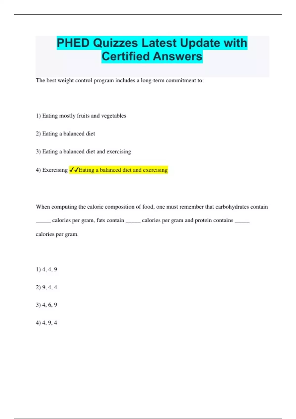 PHED Quizzes Latest Update with Certified Answers The best weight control program includes a long-term commitment to: 1) Eating mostly fruits and vegetables 2) Eating a balanced diet 3) Eating a balanced diet and exercising 4) Exercising Eating a balanced diet and exercising When computing the caloric composition of food, one must remember that carbohydrates contain _____ calories per gram, fats contain _____ calories per gram and protein contains _____ calories per gram. 1) 4, 4, 9 2) 9, 4, 4 3) 4, 6, 9 4) 4, 9, 4 5) 9, 6, 4 carbs contain 4 calories per gram, fats contain 9 calories per gram, protein contains 4 calories per gram 4, 9, 4 To contribute MOST positively to a healthy lifestyle a person should... 1) Eat a high fat diet. 2) Maintain cardiovascular fitness through aerobic activity. 3) Have your blood pressure checked often. 4) Have regular medical checkups. Maintain cardiovascular fitness through aerobic activity. Question 4 (1 point) The minimum number of calories needed in a day is approximately... 1) 1000 for women and 1500 for men 2) 1500 for men and 1200 for women 3) 1100 for women and 1400 for men 4) 1200 for men and 1500 for women 1500 for men and 1200 for women The term wellness can be defined as a state of optimal health and well-being, not simply the absence of illness, but an improved quality of life. 1) True 2) False True Benefits of a cardiorespiratory program include: 1) decreased resting blood pressures. 2) decreased recovery times following exercise. 3) an increase in oxygen consumption. 4) a decrease in resting heart rate. 5) all of theses choices. all of these choices Which of the following is a benefit of fitness and wellness? 1) Increased risk for chronic diseases and illness