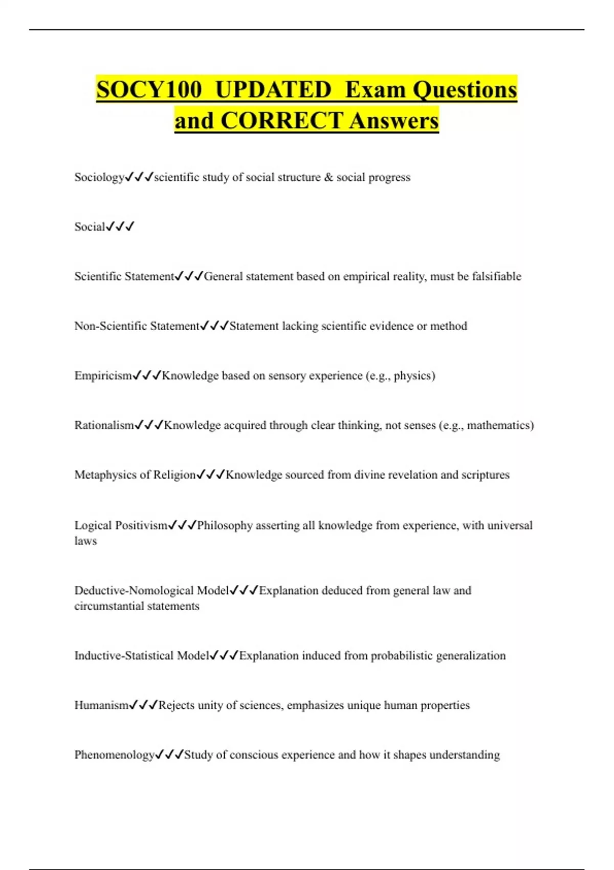 SOCY100 UPDATED Exam Questions and CORRECT Answers