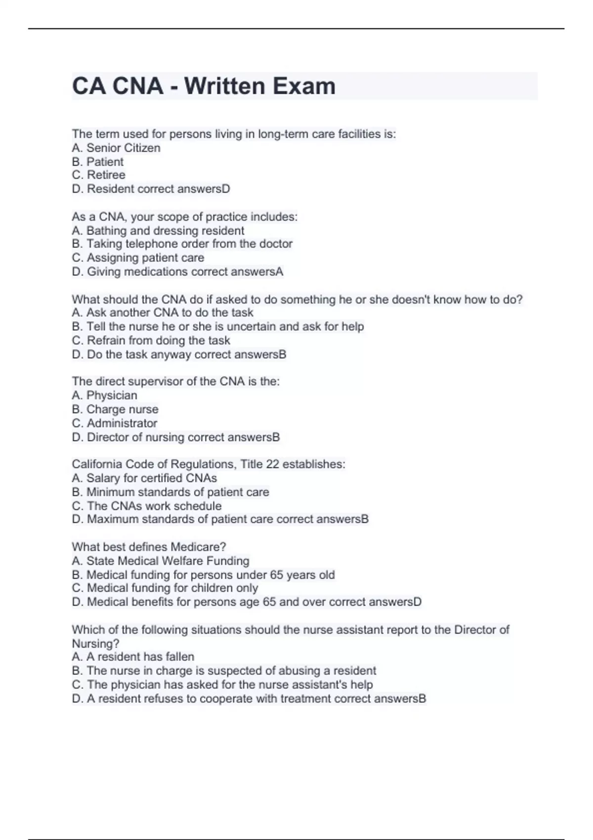The term used for persons living in long-term care facilities is: A. Senior Citizen B. Patient C. Retiree D. Resident correct answersD As a CNA, your scope of practice includes: A. Bathing and dressing resident B. Taking telephone order from the doctor C. Assigning patient care D. Giving medications correct answersA What should the CNA do if asked to do something he or she doesn't know how to do? A. Ask another CNA to do the task B. Tell the nurse he or she is uncertain and ask for help C. Refrain from doing the task D. Do the task anyway correct answersB The direct supervisor of the CNA is the: A. Physician B. Charge nurse C. Administrator D. Director of nursing correct answersB California Code of Regulations, Title 22 establishes: A. Salary for certified CNAs B. Minimum standards of patient care C. The CNAs work schedule D. Maximum standards of patient care correct answersB What best defines Medicare? A. State Medical Welfare Funding B. Medical funding for persons under 65 years old C. Medical funding for children only D. Medical benefits for persons age 65 and over correct answersD Which of the following situations should the nurse assistant report to the Director of Nursing? A. A resident has fallen B. The nurse in charge is suspected of abusing a resident C. The physician has asked for the nurse assistant's help D. A resident refuses to cooperate with treatment correct answersB