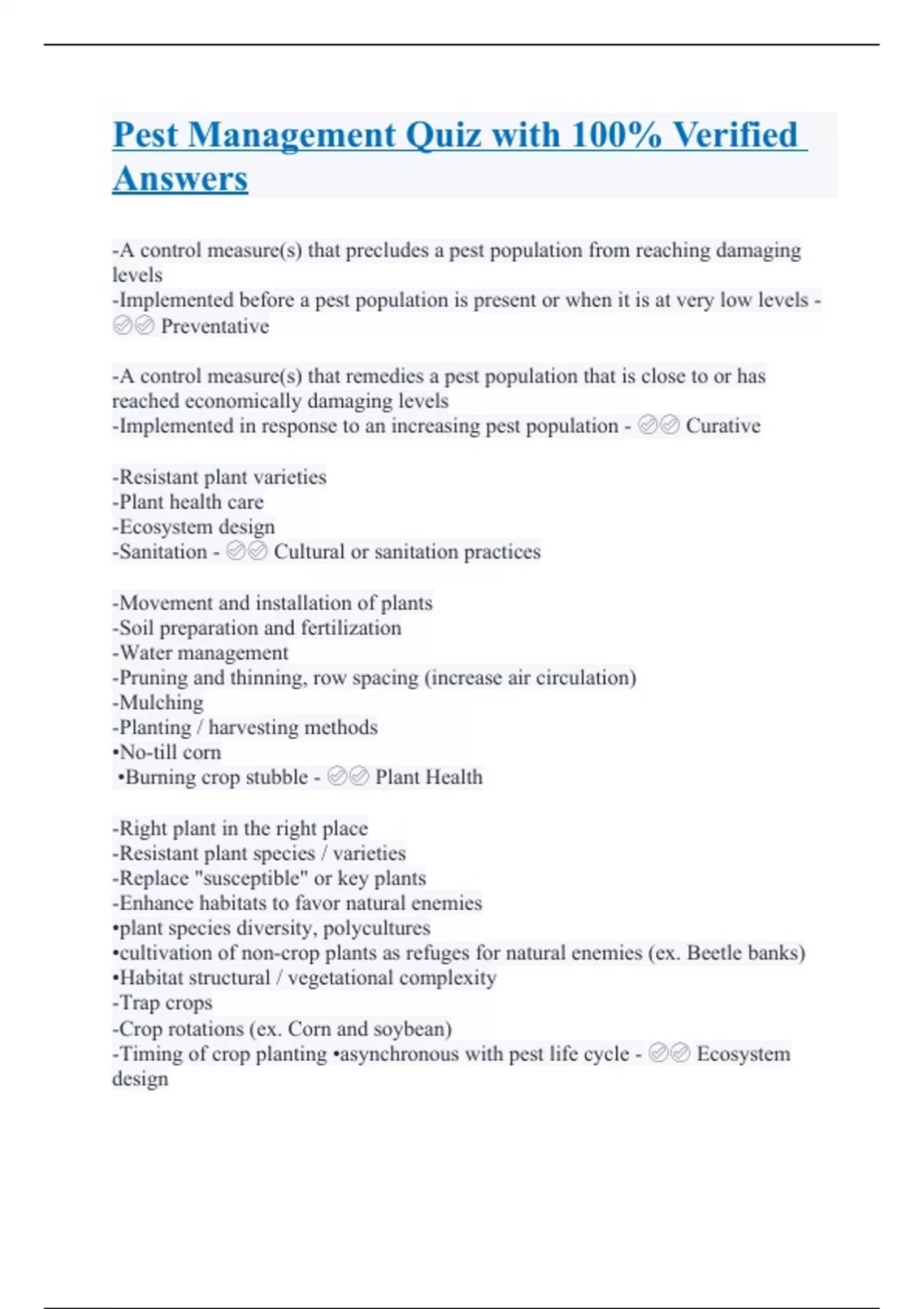 -A control measure(s) that precludes a pest population from reaching damaging levels -Implemented before a pest population is present or when it is at very low levels - Preventative -A control measure(s) that remedies a pest population that is close to or has reached economically damaging levels -Implemented in response to an increasing pest population - Curative -Resistant plant varieties -Plant health care -Ecosystem design -Sanitation - Cultural or sanitation practices -Movement and installation of plants -Soil preparation and fertilization -Water management -Pruning and thinning, row spacing (increase air circulation) -Mulching -Planting / harvesting methods •No-till corn •Burning crop stubble - Plant Health -Right plant in the right place -Resistant plant species / varieties -Replace "susceptible" or key plants -Enhance habitats to favor natural enemies •plant species diversity, polycultures •cultivation of non-crop plants as refuges for natural enemies (ex. Beetle banks) •Habitat structural / vegetational complexity -Trap crops -Crop rotations (ex. Corn and soybean) -Timing of crop planting •asynchronous with pest life cycle - Ecosystem design Some pests can be avoided by planting a crop before a pest moves into the area. Some root rot and germination problems can be avoided by later plantings. - Planting Dates