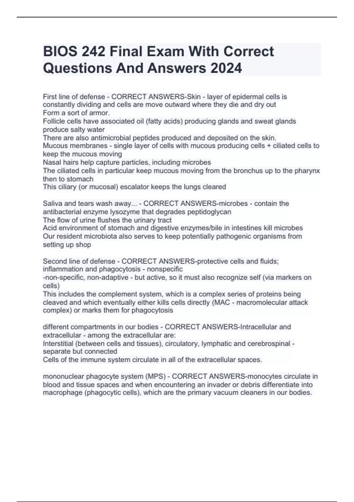 First line of defense - CORRECT ANSWERS-Skin - layer of epidermal cells is