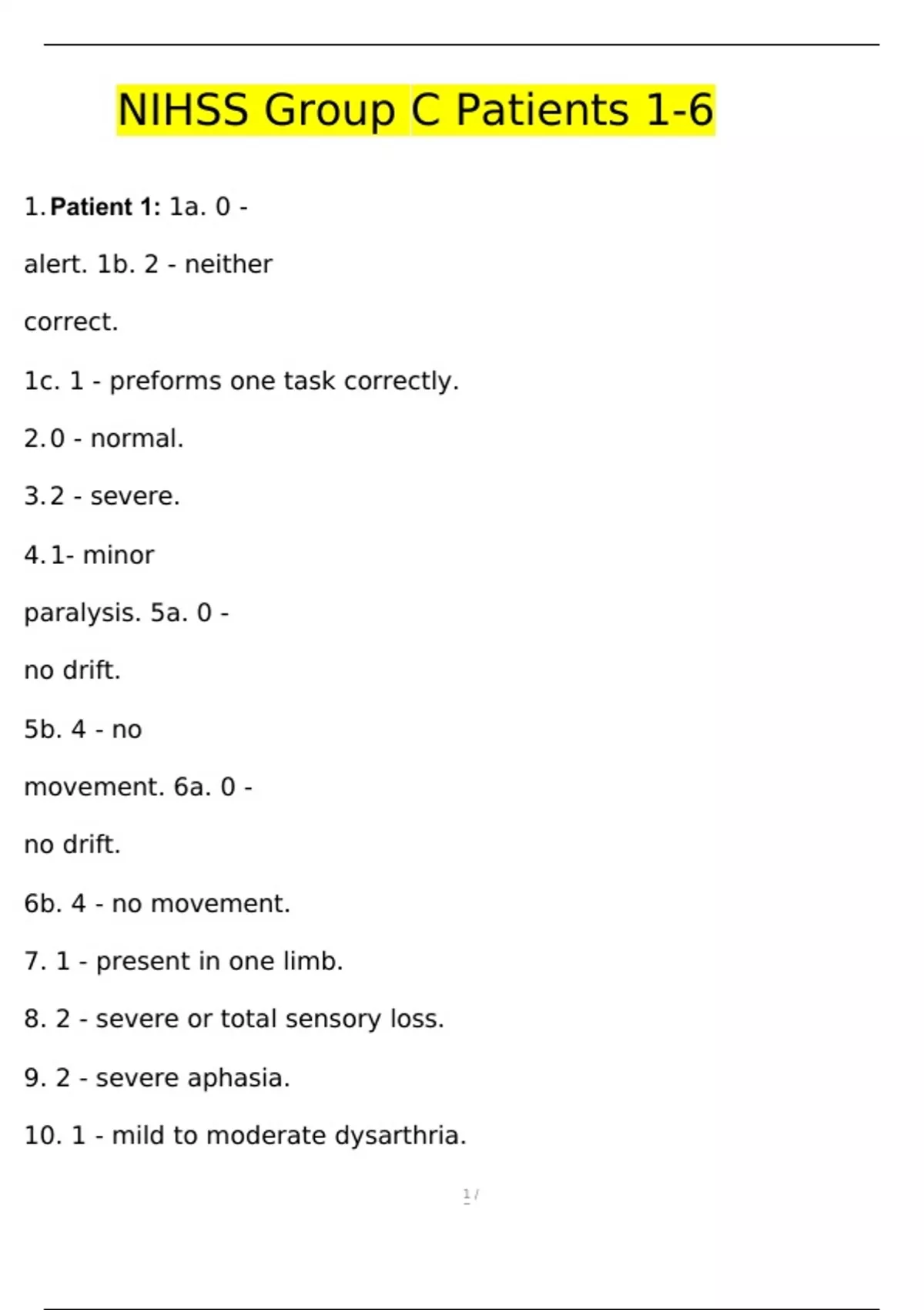 NIHSS Group C - Patients 1-6 Questions with 100% Correct Answers | Updated & Verified