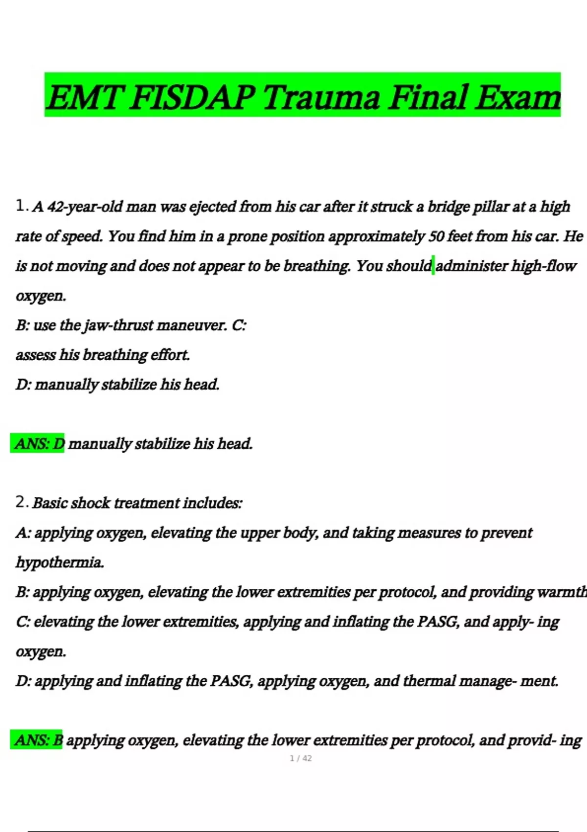 EMT FISDAP Trauma Final Exam QUESTIONS AND VERIFIED ANSWERS (2024 / 2025) / A+ GRADE EMT FISDAP Trauma Final Exam QUESTIONS AND VERIFIED ANSWERS (2024 / 2025) / A+ GRADE EMT FISDAP Trauma Final Exam QUESTIONS AND VERIFIED ANSWERS (2024 / 2025) / A+ GRADE EMT FISDAP Trauma Final Exam QUESTIONS AND VERIFIED ANSWERS (2024 / 2025) / A+ GRADE EMT FISDAP Trauma Final Exam QUESTIONS AND VERIFIED ANSWERS (2024 / 2025) / A+ GRADE