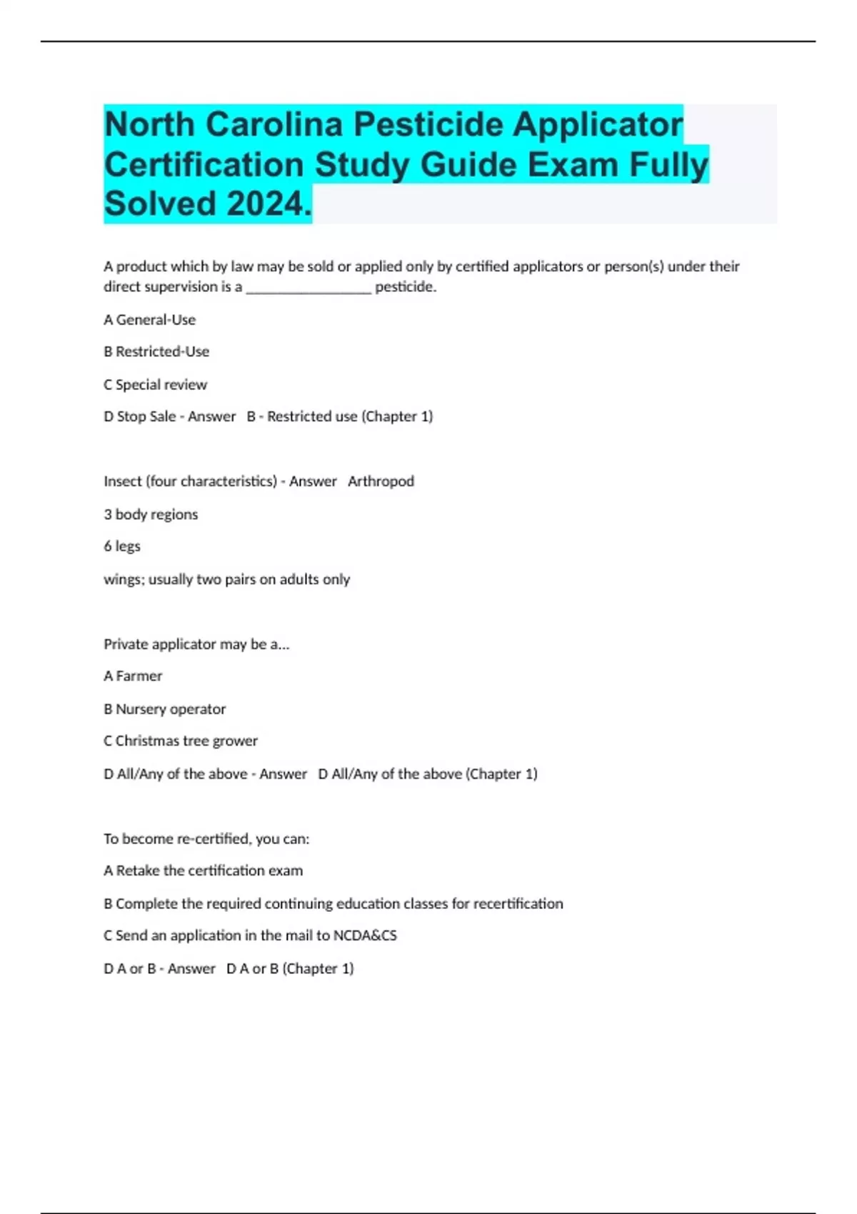 A product which by law may be sold or applied only by certified applicators or person(s) under their direct supervision is a ________________ pesticide. A General-Use B Restricted-Use C Special review D Stop Sale - Answer B - Restricted use (Chapter 1) Insect (four characteristics) - Answer Arthropod 3 body regions 6 legs wings; usually two pairs on adults only Private applicator may be a... A Farmer B Nursery operator C Christmas tree grower D All/Any of the above - Answer D All/Any of the above (Chapter 1) To become re-certified, you can: A Retake the certification exam B Complete the required continuing education classes for recertification C Send an application in the mail to NCDA&CS D A or B - Answer D A or B (Chapter 1)