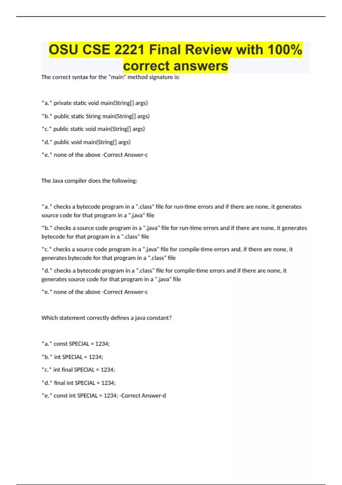 OSU CSE 2221 Final Review with 100% correct answers The correct syntax for the "main" method signature is: *a.* private static void main(String[] args) *b.* public static String main(String[] args) *c.* public static void main(String[] args) *d.* public void main(String[] args) *e.* none of the above -Correct Answer-c The Java compiler does the following: *a.* checks a bytecode program in a ".class" file for run-time errors and if there are none, it generates source code for that program in a ".java" file *b.* checks a source code program in a ".java" file for run-time errors and if there are none, it generates bytecode for that program in a ".class" file *c.* checks a source code program in a ".java" file for compile-time errors and, if there are none, it generates bytecode for that program in a ".class" file *d.* checks a bytecode program in a ".class" file for compile-time errors and if there are none, it generates source code for that program in a ".java" file *e.* none of the above -Correct Answer-c Which statement correctly defines a java constant? *a.* const SPECIAL = 1234; *b.* int SPECIAL = 1234; *c.* int final SPECIAL = 1234; *d.* final int SPECIAL = 1234; *e.* const int SPECIAL = 1234; -Correct Answer-d What is the value of s after the following statement: String s = (!true) + " : " + (10 + 4) + " is 104"; *a.* "!true : 104 is 104" *b.* "false : 104 is 104" *c.* "!true : 14 is 104" *d.* "false : 14 is 104" *e.* Thi