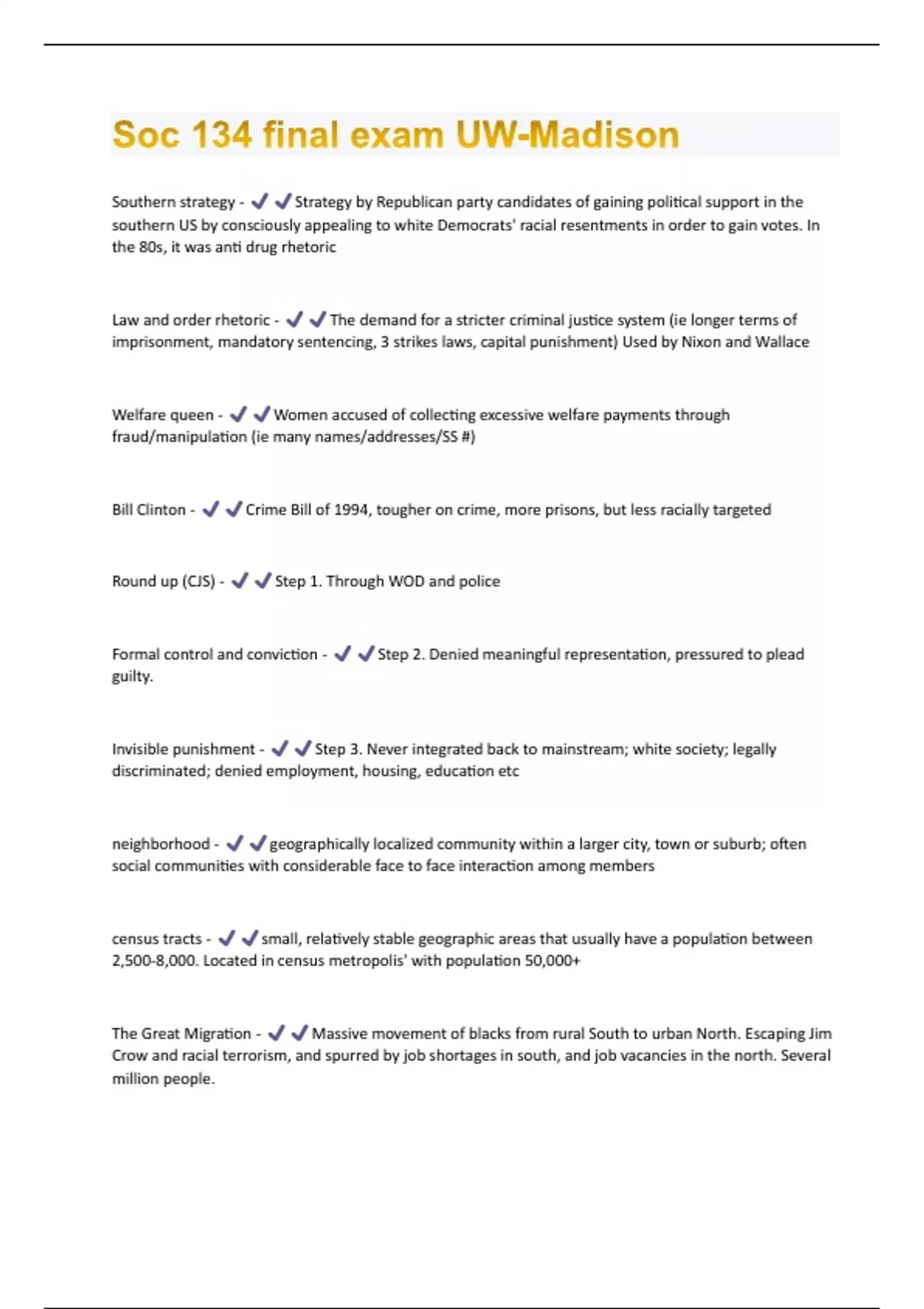 Southern strategy - Strategy by Republican party candidates of gaining political support in the southern US by consciously appealing to white Democrats' racial resentments in order to gain votes. In the 80s, it was anti drug rhetoric Law and order rhetoric - The demand for a stricter criminal justice system (ie longer terms of imprisonment, mandatory sentencing, 3 strikes laws, capital punishment) Used by Nixon and Wallace Welfare queen - Women accused of collecting excessive welfare payments through fraud/manipulation (ie many names/addresses/SS #) Bill Clinton - Crime Bill of 1994, tougher on crime, more prisons, but less racially targeted Round up (CJS) - Step 1. Through WOD and police Formal control and conviction - Step 2. Denied meaningful representation, pressured to plead guilty. Invisible punishment - Step 3. Never integrated back to mainstream; white society; legally discriminated; denied employment, housing, education etc neighborhood - geographically localized community within a larger city, town or suburb; often social communities with considerable face to face interaction among members census tracts - small, relatively stable geographic areas that usually have a population between 2,500-8,000. Located in census metropolis' with population 50,000+ The Great Migration - Massive movement of blacks from rural South to urban North. Escaping Jim Crow and racial terrorism, and spurred by job shortages in south, and job vacancies in the north. Several million people.Ghetto - a part of the city that is exclusively inhabited by members of one racial/ethnic group. Origins: many nonwhites denied loans Advanced marginality - Redlining - the practice of denying mortgage loans for homes to nonwhite residents of poor inner city neighborhoods. Financial institutions would literally draw a red line around neighborhoods Racially restrictive covenants - Contractual agreements between homeowners that prohibited purchase and sale by African Americans White flight and its causes - Moved out to suburbs in 1950s. This increased with deindustrialization and Civil rights movement Fair Housing Act - 1968. Prohibited discrimination in sale, rental, and financing of housing based on race, religion, etc Chicago Open House movement - Led by MLK and others, many demands including open housing and other basic equities Index of dissimilarity - a measure of segregation between two groups, with 0 being total integration, 100 being total segregation. Doesn't mean equal proportions, but equally spread out. Index of isolation - Measure of tendency for members of one group to live in neighborhoods where their share of the population is above the citywide average Food desert - Large geographic area where mainstream grocery stores are scarce or missing Booker T Washington - Atlanta Compromise, industrial education should develop better trained laborersWEB Dubois - NAACP, equal education, "talented tenth". Opposed Atlanta Compromise Atlanta Compromise - 1895. Agreement between BTWashington/other black leaders and southern white leaders. Southern blacks would work and submit to white rule while whites made sure blacks received basic education. Blacks would not agitate for equality, integration, justice