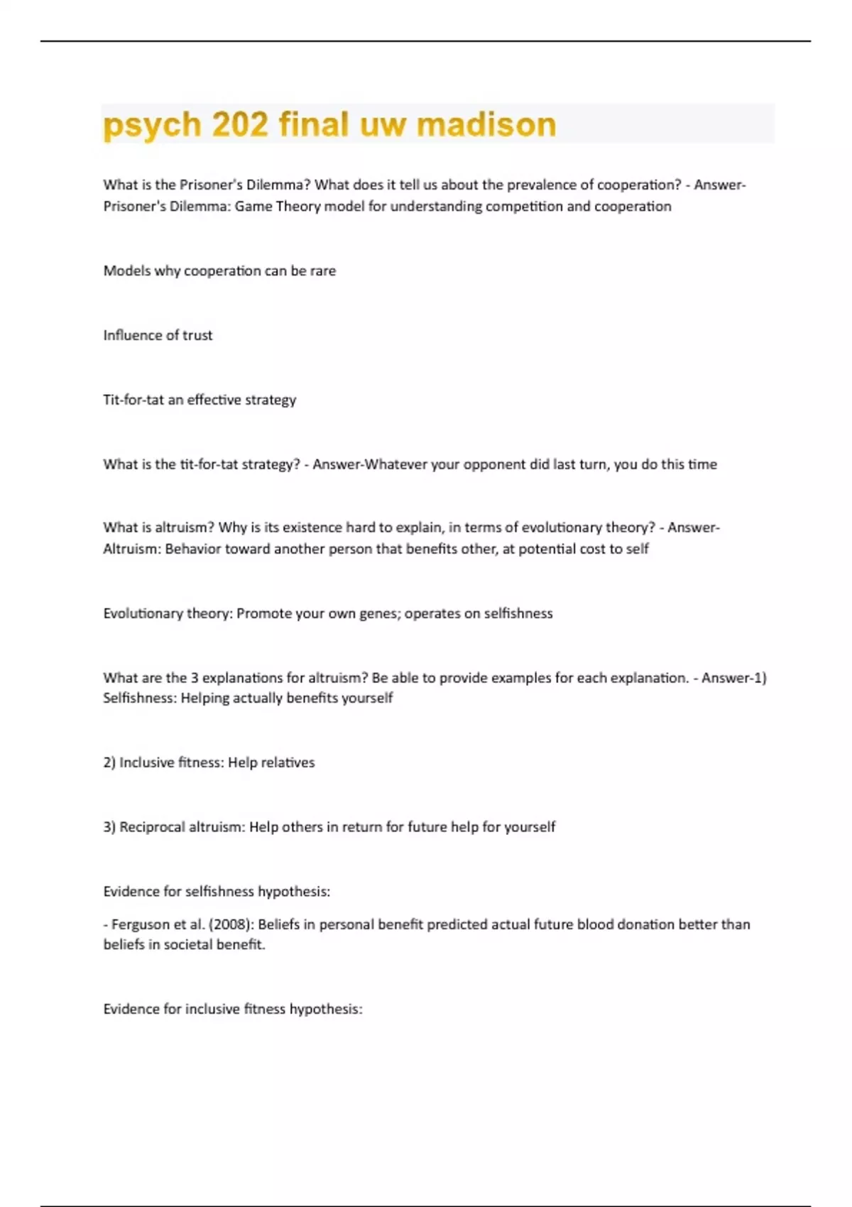 What is the Prisoner's Dilemma? What does it tell us about the prevalence of cooperation? - AnswerPrisoner's Dilemma: Game Theory model for understanding competition and cooperation Models why cooperation can be rare Influence of trust Tit-for-tat an effective strategy What is the tit-for-tat strategy? - Answer-Whatever your opponent did last turn, you do this time What is altruism? Why is its existence hard to explain, in terms of evolutionary theory? - AnswerAltruism: Behavior toward another person that benefits other, at potential cost to self Evolutionary theory: Promote your own genes; operates on selfishness What are the 3 explanations for altruism? Be able to provide examples for each explanation. - Answer-1) Selfishness: Helping actually benefits yourself 2) Inclusive fitness: Help relatives 3) Reciprocal altruism: Help others in return for future help for yourself Evidence for selfishness hypothesis: - Ferguson et al. (2008): Beliefs in personal benefit predicted actual future blood donation better than beliefs in societal benefit. Evidence for inclusive fitness hypothesis:- Adoption patterns in Oceania (Silk) Evidence for inclusive fitness hypothesis: - Alarm calls in Belding's ground squirrels Evidence for reciprocal altruism hypothesis: - Blood meal donation in vampire bats What types of psychological studies were spurred by the murder of Kitty Genovese? - Answer-Have a confederate pretend to drop a lot of books/bags they were carrying Someone pretends their car was broken down on the side of the road Point of the studies was to see what factors would influence whether or not people helped. What is the bystander effect? What factors influence the strength of the bystander effect? - AnswerBystander effect: As the number of people present increases, the likelihood of helping decreases. 1) Influencing factors: 2) Ambiguity 3) Cohesiveness Diffusion of responsibilityAmbiguity: More helping if clearer that person truly needs help Cohesiveness: More helping if member of established group; social responsibility norm What is diffusion of responsibility? - Answer-Diffusion of responsibility: Assume someone else will help, especially if large group of bystanders
