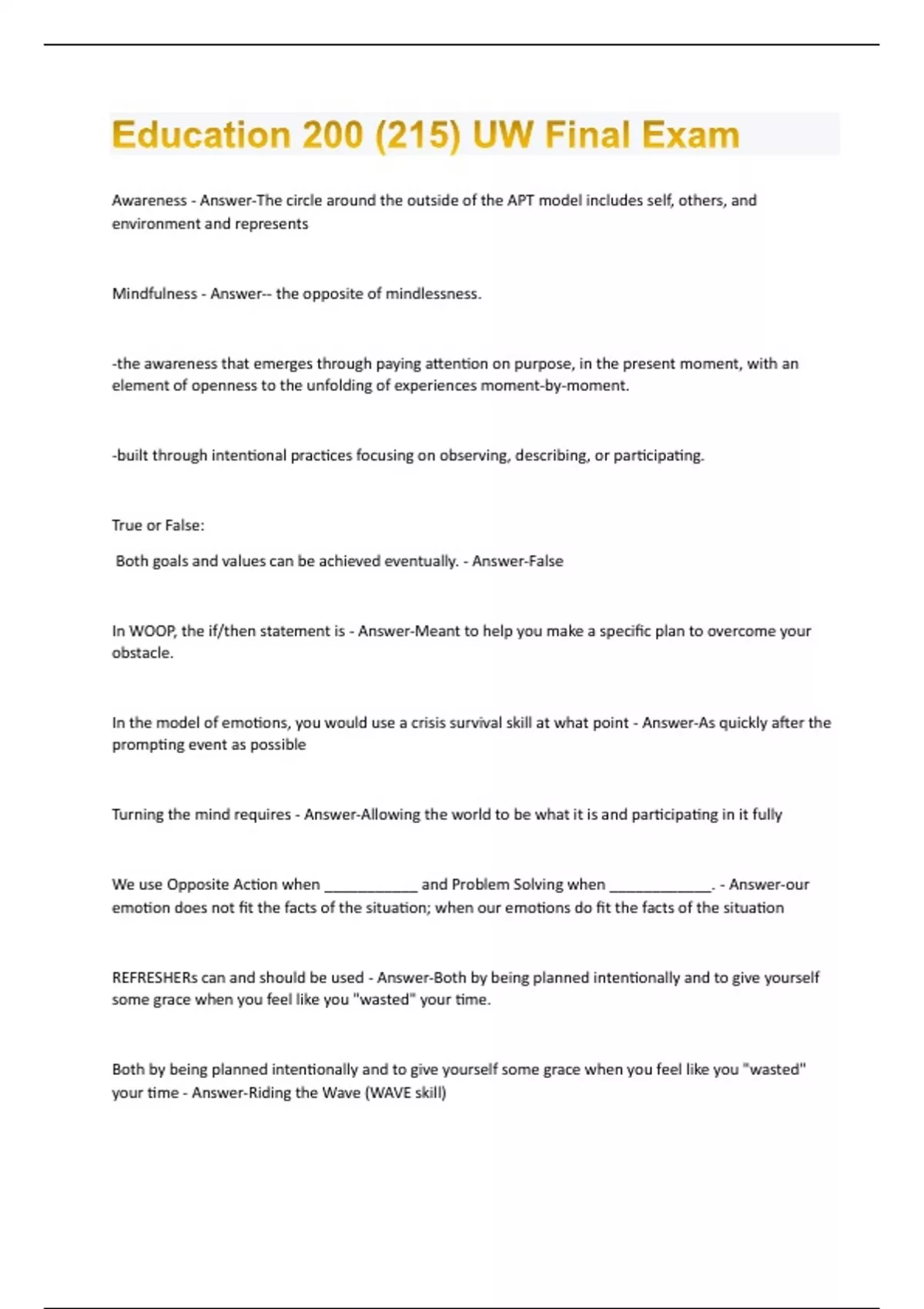 Awareness - Answer-The circle around the outside of the APT model includes self, others, and environment and represents Mindfulness - Answer-- the opposite of mindlessness. -the awareness that emerges through paying attention on purpose, in the present moment, with an element of openness to the unfolding of experiences moment-by-moment. -built through intentional practices focusing on observing, describing, or participating. True or False: Both goals and values can be achieved eventually. - Answer-False In WOOP, the if/then statement is - Answer-Meant to help you make a specific plan to overcome your obstacle. In the model of emotions, you would use a crisis survival skill at what point - Answer-As quickly after the prompting event as possible Turning the mind requires - Answer-Allowing the world to be what it is and participating in it fully We use Opposite Action when ___________ and Problem Solving when ____________. - Answer-our emotion does not fit the facts of the situation; when our emotions do fit the facts of the situation REFRESHERs can and should be used - Answer-Both by being planned intentionally and to give yourself some grace when you feel like you "wasted" your time. Both by being planned intentionally and to give yourself some grace when you feel like you "wasted" your time - Answer-Riding the Wave (WAVE skill)Why do we need to manage stress? - Answer-It effects our body, mind, and our behaviour. Body: Headache, Muscle tension or pain, Cardiovascular, Fatigue, change in sex drive, Stomach upset, Sleep problem Our mind: Anxiety, Restlessness, Lack of motivation, Memory problems, Irritability or anger, Sadness or Depression. Our behavior: Angry outbursts, Avoidance of important activities, Overeating or under-eating, Social withdrawal, Drug or Alcohol abuse. Resilience - Answer-The ability to survive and thrive in despite of life's daily ups and downs, curve balls, and stressors. Survive - Answer--Navigate stressful situations successfully. -Bounce back after a challenging, adverse situation -Minimize life suffering. Thrive - Answer--Ability to flourish in life -Optimize being and life satisfaction. -Be as effective as possible in everything you do. Difference between acceptance and Change - Answer-Acceptance: -Validation -Mindfulness skills -Distress Tolerance skillsChange: -Problem-solving -Emotion Regulation skills -Interpersonal Effectiveness skills Neuroplasticity - Answer-ability to change the the brain's structure and function in response to enriching experience that consists of: -learning new skills -continual or increased use of skills -enhancing overall performance in areas that initially view as weakness. 3 States of mind - Answer--Reasonable mind: (What I think to be) -Wise Mind (What I know to be) -Emotional Mind (What I feel to be) "What" skills - Answer-Increased awareness through mindfulness practices. --> what + how skills --> better decision making and coping strategies. -Observe: wordless watching, paying attention with reacting. -Describe: putting what you observed into words. -Participate: throwing yourself completely in "How" skills - Answer-Increased awareness through mindfulness practices. --> what + how skills --> better decision making and coping strategies. -Nonjudgmental: see but don't evaluate, just the facts. -One mindfully: being completely present -Effectively: focus on what worksValues - Answer--Represent chosen life paths that motivate us, enrich our lives, and give us a sense of purpose and meaning -Are like a life compass or roadmap that points us in the direction that matters most•Are about figuring out what matters most in different aspects of our lives -Are about what we care about and want to be known by our family, friends, work colleagues, and community members -Can never be attained -A value is a chosen life path. -Values involve a direction we keep moving toward--we never stop. -Values are ongoing actions or decisions that never end. -Values add meaning and purpose should inform our goals and decisions.
