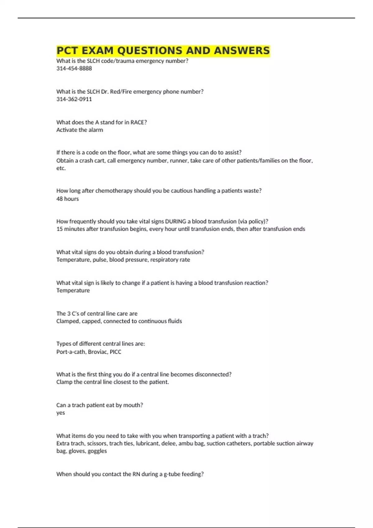PCT EXAM QUESTIONS AND ANSWERS What is the SLCH code/trauma emergency number? What is the SLCH Dr. Red/Fire emergency phone number? What does the A stand for in RACE? Activate the alarm If there is a code on the floor, what are some things you can do to assist? Obtain a crash cart, call emergency number, runner, take care of other patients/families on the floor, etc. How long after chemotherapy should you be cautious handling a patients waste? 48 hours How frequently should you take vital signs DURING a blood transfusion (via policy)? 15 minutes after transfusion begins, every hour until transfusion ends, then after transfusion ends What vital signs do you obtain during a blood transfusion? Temperature, pulse, blood pressure, respiratory rate What vital sign is likely to change if a patient is having a blood transfusion reaction? Temperature The 3 C's of central line care are Clamped, capped, connected to continuous fluids Types of different central lines are: Port-a-cath, Broviac, PICC What is the first thing you do if a central line becomes disconnected? Clamp the central line closest to the patient. Can a trach patient eat by mouth? yes What items do you need to take with you when transporting a patient with a trach? Extra trach, scissors, trach ties, lubricant, delee, ambu bag, suction catheters, portable suction airway bag, gloves, goggles When should you contact the RN during a g-tube feeding?
