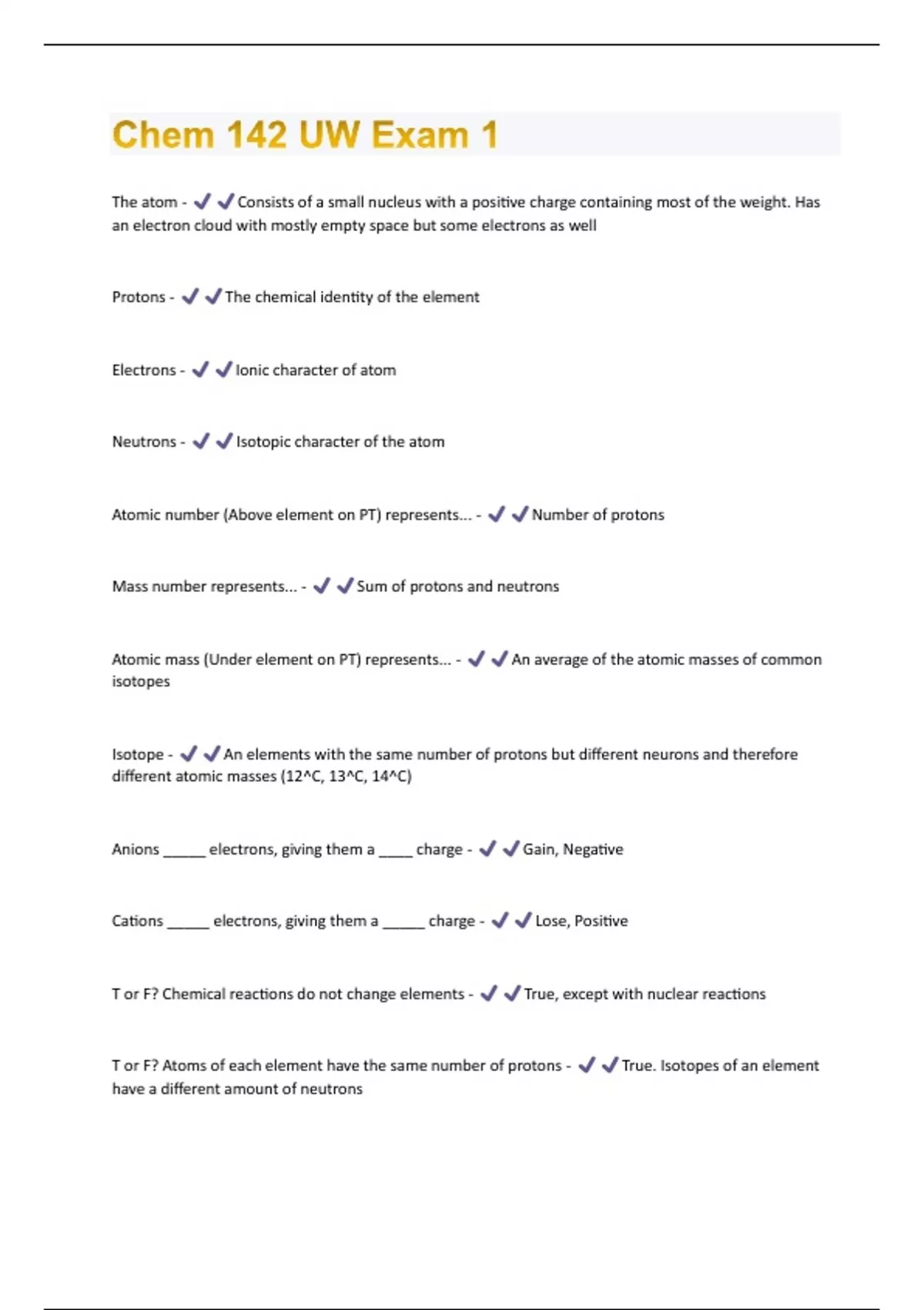 The atom - Consists of a small nucleus with a positive charge containing most of the weight. Has an electron cloud with mostly empty space but some electrons as well Protons - The chemical identity of the element Electrons - Ionic character of atom Neutrons - Isotopic character of the atom Atomic number (Above element on PT) represents... - Number of protons Mass number represents... - Sum of protons and neutrons Atomic mass (Under element on PT) represents... - An average of the atomic masses of common isotopes Isotope - An elements with the same number of protons but different neurons and therefore different atomic masses (12^C, 13^C, 14^C) Anions _____ electrons, giving them a ____ charge - Gain, Negative Cations _____ electrons, giving them a _____ charge - Lose, Positive T or F? Chemical reactions do not change elements - True, except with nuclear reactions T or F? Atoms of each element have the same number of protons - True. Isotopes of an element have a different amount of neutronsProperties of a Metal (4 total) - 1) Conduct heat/electricity 2) Malleable 3) Ductile 4) Tend to lose electrons (+ charge) Properties of Nonmetals (3 total) - 1) Dull/brittle 2)Nonconductor 3) Gain electrons (-charge) Properties of Semimetals - Have properties of both nonmetals and metals Groups move.... - across the periodic table Periods move... - up and down the periodic table Group 1A - Alkaline metals Group 2A - Alkaline Earth Metals Group 7A - Halogens (nonmetal) Group 8A - Noble Gases (nonmetal) Transition metals have multiple types of _____ - cations Main types of bonds that can be formed - Ionic (transfer of e-) and covalent (sharing e-) Molecule formation occurs in an attempt to... - complete an octet for both atoms Chemical bonds - Hold atoms or ions together in a compoundIonic compounds - The result of an electron transfer. Consists of a network of anions & cations with an overall charge of 0 Colors of the visible spectrum and range they're in? - ROYGIBIV: Red (700nm), orange, yellow, green, blue, indigo, violet(400nm). Order of electromagnetic spectrum (low to high wavelength) - y rays, x rays, ultra violet, visible spectrum, infrared, microwaves, radio waves, long radio waves.