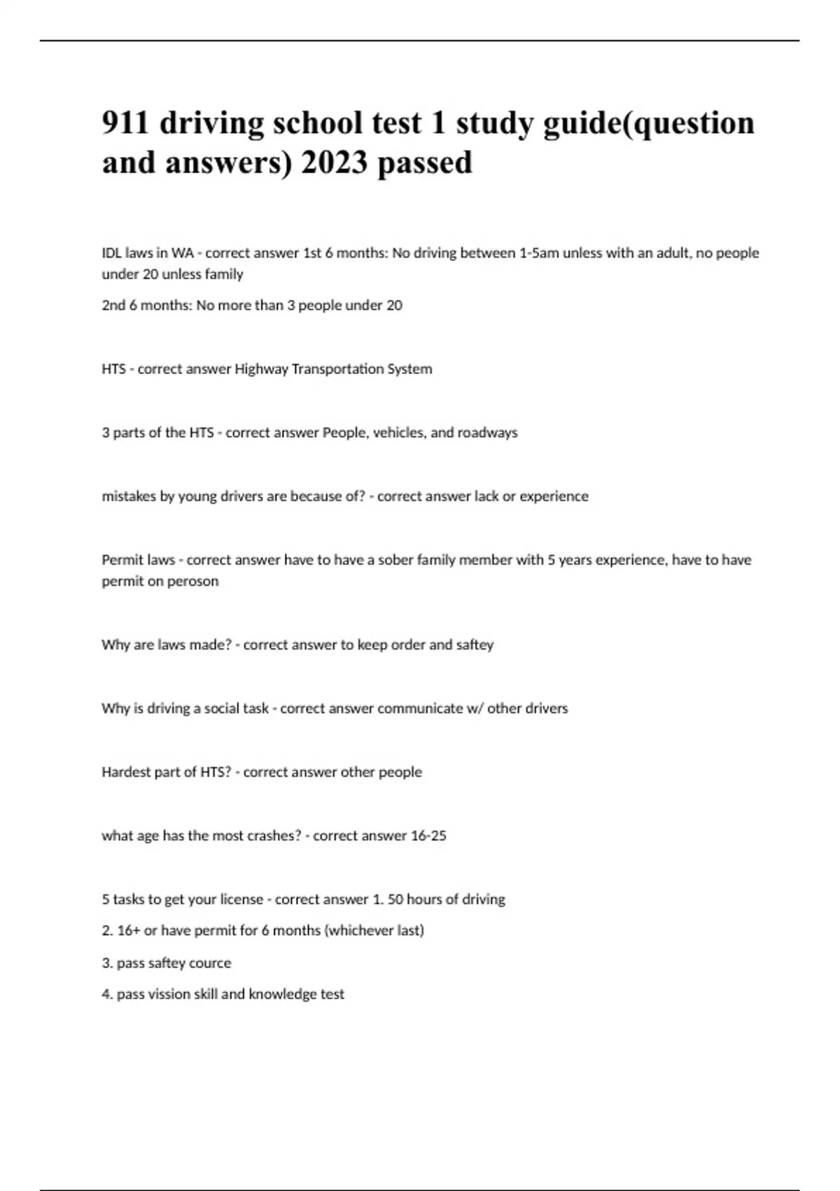 911 driving school test 1 study guide(question and answers) 2023/2024 passed IDL laws in WA - correct answer 1st 6 months: No driving between 1-5am unless with an adult, no people under 20 unless family 2nd 6 months: No more than 3 people under 20 HTS - correct answer Highway Transportation System 3 parts of the HTS - correct answer People, vehicles, and roadways mistakes by young drivers are because of? - correct answer lack or experience Permit laws - correct answer have to have a sober family member with 5 years experience, have to have permit on peroson Why are laws made? - correct answer to keep order and saftey Why is driving a social task - correct answer communicate w/ other drivers Hardest part of HTS? - correct answer other people what age has the most crashes? - correct answer 16-25 5 tasks to get your license - correct answer 1. 50 hours of driving 2. 16+ or have permit for 6 months (whichever last) 3. pass saftey cource 4. pass vission skill and knowledge test