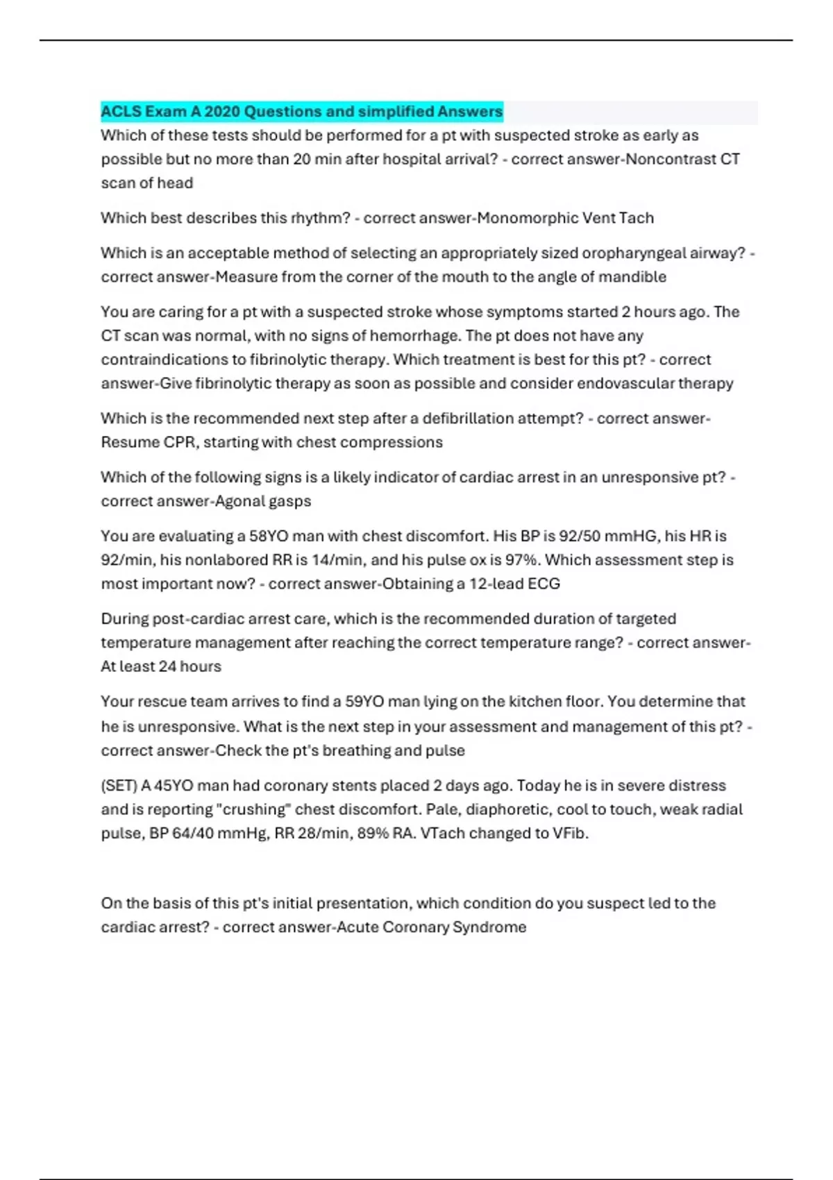ACLS Exam A 2020 ACLS Exam A 2020 with questions and answers which are 100% correct