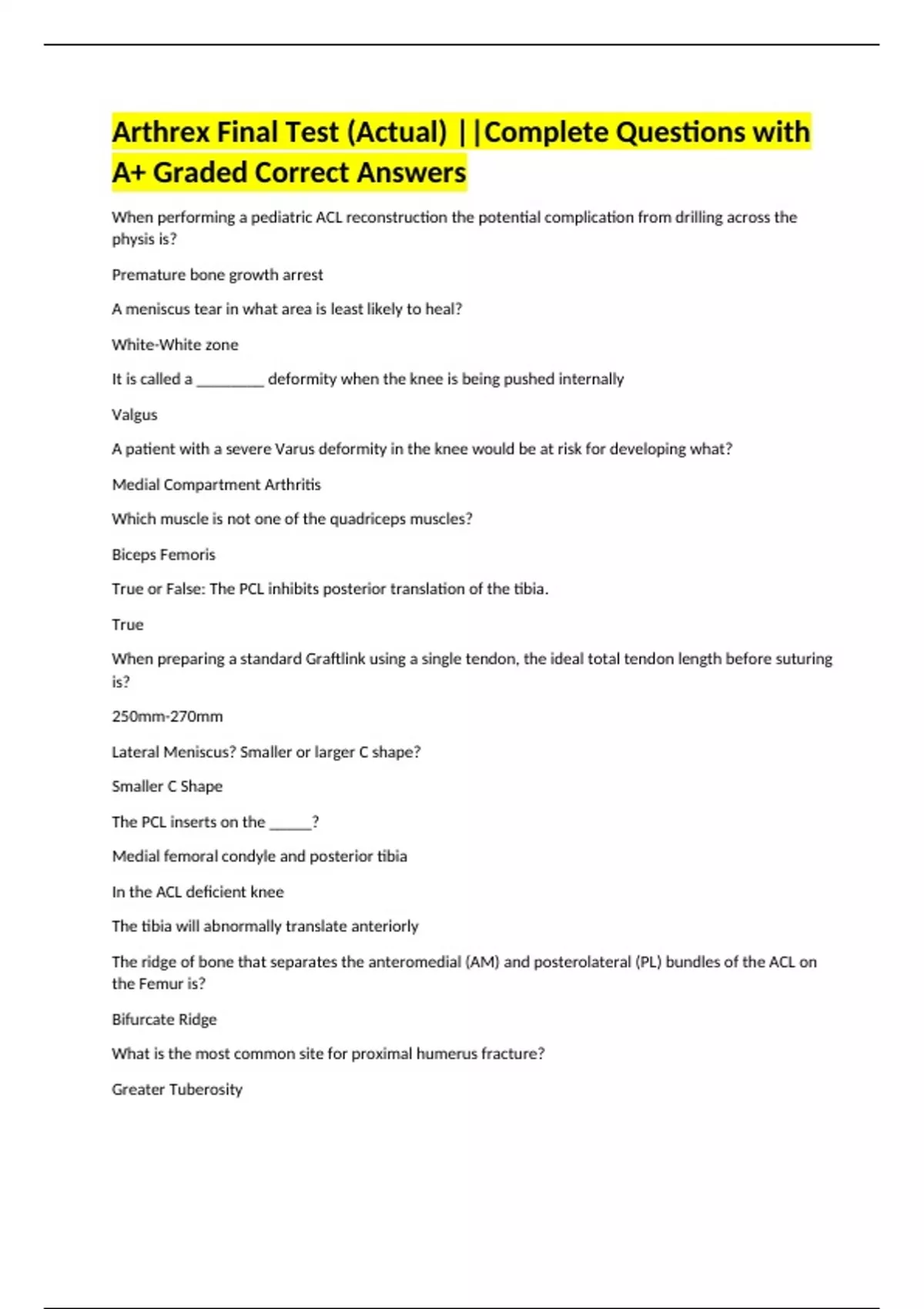 Arthrex Final Test (Actual) ||Complete Questions with A+ Graded Correct Answers When performing a pediatric ACL reconstruction the potential complication from drilling across the physis is? Premature bone growth arrest A meniscus tear in what area is least likely to heal? White-White zone It is called a ________ deformity when the knee is being pushed internally Valgus A patient with a severe Varus deformity in the knee would be at risk for developing what? Medial Compartment Arthritis Which muscle is not one of the quadriceps muscles? Biceps Femoris True or False: The PCL inhibits posterior translation of the tibia. True When preparing a standard Graftlink using a single tendon, the ideal total tendon length before suturing is? 250mm-270mm Lateral Meniscus? Smaller or larger C shape? Smaller C Shape The PCL inserts on the _____? Medial femoral condyle and posterior tibia In the ACL deficient knee The tibia will abnormally translate anteriorly The ridge of bone that separates the anteromedial (AM) and posterolateral (PL) bundles of the ACL on the Femur is? Bifurcate Ridge What is the most common site for proximal humerus fracture? Greater Tuberosity