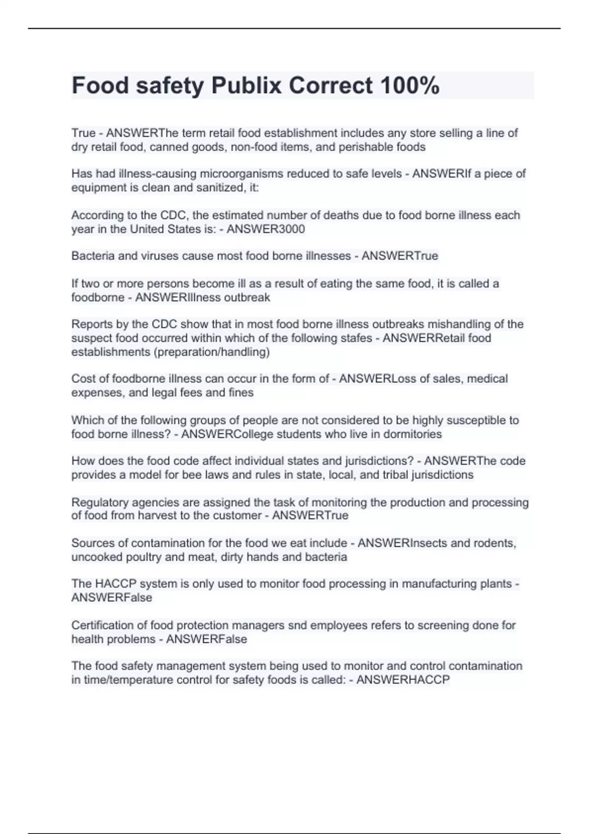 True - ANSWERThe term retail food establishment includes any store selling a line of dry retail food, canned goods, non-food items, and perishable foods Has had illness-causing microorganisms reduced to safe levels - ANSWERIf a piece of equipment is clean and sanitized, it: According to the CDC, the estimated number of deaths due to food borne illness each year in the United States is: - ANSWER3000 Bacteria and viruses cause most food borne illnesses - ANSWERTrue If two or more persons become ill as a result of eating the same food, it is called a foodborne - ANSWERIllness outbreak Reports by the CDC show that in most food borne illness outbreaks mishandling of the suspect food occurred within which of the following stafes - ANSWERRetail food establishments (preparation/handling) Cost of foodborne illness can occur in the form of - ANSWERLoss of sales, medical expenses, and legal fees and fines Which of the following groups of people are not considered to be highly susceptible to food borne illness? - ANSWERCollege students who live in dormitories How does the food code affect individual states and jurisdictions? - ANSWERThe code provides a model for bee laws and rules in state, local, and tribal jurisdictions Regulatory agencies are assigned the task of monitoring the production and processing of food from harvest to the customer -