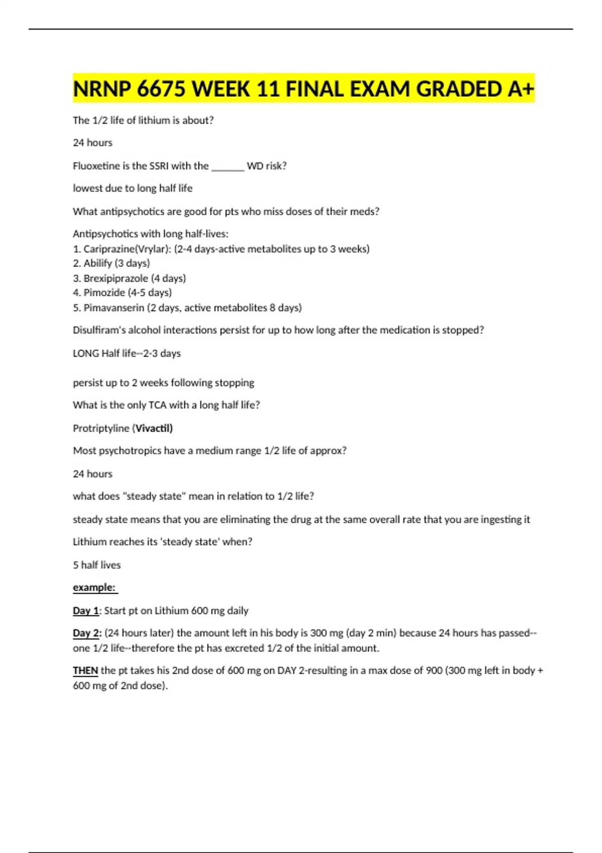NRNP 6675 WEEK 11 FINAL EXAM GRADED A+ The 1/2 life of lithium is about? 24 hours Fluoxetine is the SSRI with the ______ WD risk? lowest due to long half life What antipsychotics are good for pts who miss doses of their meds? Antipsychotics with long half-lives: 1. Cariprazine(Vrylar): (2-4 days-active metabolites up to 3 weeks) 2. Abilify (3 days) 3. Brexipiprazole (4 days) 4. Pimozide (4-5 days) 5. Pimavanserin (2 days, active metabolites 8 days) Disulfiram's alcohol interactions persist for up to how long after the medication is stopped? LONG Half life--2-3 days persist up to 2 weeks following stopping What is the only TCA with a long half life? Protriptyline (Vivactil) Most psychotropics have a medium range 1/2 life of approx? 24 hours what does "steady state" mean in relation to 1/2 life? steady state means that you are eliminating the drug at the same overall rate that you are ingesting it Lithium reaches its 'steady state' when? 5 half lives example: Day 1: Start pt on Lithium 600 mg daily Day 2: (24 hours later) the amount left in his body is 300 mg (day 2 min) because 24 hours has passed--one 1/2 life--therefore the pt has excreted 1/2 of the initial amount. THEN the pt takes his 2nd dose of 600 mg on DAY 2-resulting in a max dose of 900 (300 mg left in body + 600 mg of 2nd dose). DAY 3: starts off with 450 mg (1/2 of the 900 mg in pt's system) and after taking the day 3 600 mg dose, the pt now has a total of 1050 mg. Due to the steady state of Lithium, when do we draw a blood level? 5 half lives if you check any earlier, the trough level will underestimate the actual level the pt is on after achieving steady state Fluoxetine has a half life of about? 2 weeks 1/2 life take 2.5 months to achieve steady state Most psychotropic medications operate in this fashion: "when you double the dose, the serum dose doubles." *minus three SRIs and three anticonvulsants (Fluoxetine, fluvoxamine, paxil, gabapentin, valproate and carbamazepine) _________induces it's own metabolism, hastening excretion and shortening it's half life A. Carbamazepine (Tegretol) *this effect begins to "rev up" after 2-4 weeks--which is why a carbamazepine level is so important on obtaining 1-2 months after starting Tegretol. 3 multiple choice options Carbamazepine (Tegretol) level should be checked how soon after starting to take this med? 1-2 months due to Tegretol inducing it's own metabolism, hastening excretion and shortening it's half life. _____ has trouble getting a "serum" level because it binds to proteins that render it therapeutically inactive? A. Valproate Acid (Depakote) -this is particularly true at the lower levels (eg. <50 mcg/mL), so you can expect dose changes to make a more dramatic difference when the pt's depakote level is in the higher range 3 multiple choice options _______'s serum level is the opposite of Valproic Acid: it rises quickly at first and then slows down? Gabapentin *gabapentin saturates the transporters that absorb it in the small intestine, causing its levels to rise at a snails pace when the dosage goes above a certain saturation point (around 900 mg/day). -from there, the saturation trickles down; @ 900 mg/day--60% is absorbed. @ 1200 mg/day--50 % is absorbed. @3000 mg/day--30% of the gabapentin is absorbed. Due to Gabapentin's serum pattern for dosage: @ 900 mg/day, how much is the patient absorbing? @ 0900mg/day---60% is absorbed. Due to Gabapentin's serum pattern for dosage: @ 1200 mg/day, how much is the patient absorbing? @ 1200 mg/day--50 % is absorbed. Due to Gabapentin's serum pattern for dosage: @ 3000 mg/day, how much is the patient absorbing? @3000 mg/day--30% of the gabapentin is absorbed. Carbamazepine (Tegretol's) serum level drops after how long after stopping taking it? 1-2 months For Valproate (Depakote), ___ dose changes can have big effects once the level is beyond 50 mcg/mL? SMALL potency refers to a drug's> power per unit -or the amount of pharmacological activity per milligram. Delayed release= modified release "dont get absorbed until they have traveled to a specific site in the gut Intermediate release (IR) medications: dissolve rapidly in the GI tract and are absorbed in an hour or two the serum concentrations of IR medications spike quickly and then fall back down, leading to what? leading to low trough levels before the next dose. *These ups and downs in serum levels can cause SE or efficacy problems. *the ups and downs in serum levels of IR medications can cause what? can cause SE or efficacy problems. Bupropion can increase the risk of what? Seizures *IF the serum level peaks too high IR stimulants can lose ____ in the afternoon? efficacy due to IR effect The rise and fall of Haldol levels increases what? the likelihood of dystonic reactions in MODERATE RELEASE/DELAYED RELEASE dissolvable solutions or "dissolvable control", the medicine does what? slowly diffuses out of a semi-permeable membrane ex. Effexor ER capsules, Wellbutrin XL and Focalin XR in MODERATE RELEASE/DELAYED RELEASE is osmotic release pills, the medicine does what? is pushed out by a tiny pump that is powered by a osmotic flow of water across a semipermeable membrane ex. Concerta, Invega, and Effexor ER tablets Pros of Modified Release/Delayed Release meds? D. All of the above 3 multiple choice options Cons of Modified Release/Delayed Release meds? D. All of the above 3 multiple choice options Medicines that are preferred in IR? Benzos and stimulants Most ______ medications cannot be split or crushed without disrupting the integrity of the time-release mechanism? MR/delayed release Concerns when treating geriatric patients with psychotherapeutic drugs include all of the following EXCEPT? C. Elderly persons may metabolize psychotherapeutic drugs more rapidly 3 multiple choice options The treatment of others equitably and distribution of benefits/burdens fairly is known as which of the following? B. Justice a fair an equitable distribution of health resources 3 multiple choice option