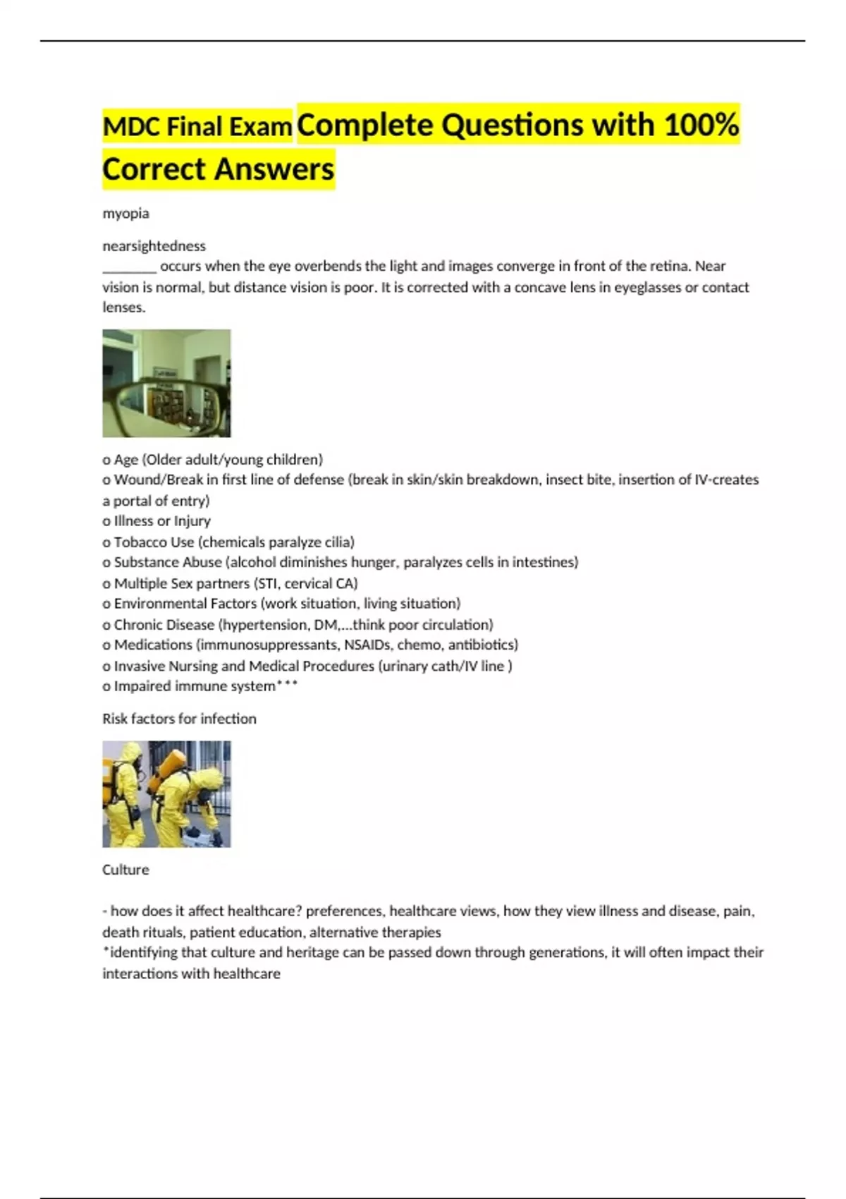 MDC Final Exam Complete Questions with 100% Correct Answers myopia nearsightedness _______ occurs when the eye overbends the light and images converge in front of the retina. Near vision is normal, but distance vision is poor. It is corrected with a concave lens in eyeglasses or contact lenses. o Age (Older adult/young children) o Wound/Break in first line of defense (break in skin/skin breakdown, insect bite, insertion of IV-creates a portal of entry) o Illness or Injury o Tobacco Use (chemicals paralyze cilia) o Substance Abuse (alcohol diminishes hunger, paralyzes cells in intestines) o Multiple Sex partners (STI, cervical CA) o Environmental Factors (work situation, living situation) o Chronic Disease (hypertension, DM,...think poor circulation) o Medications (immunosuppressants, NSAIDs, chemo, antibiotics) o Invasive Nursing and Medical Procedures (urinary cath/IV line ) o Impaired immune system*** Risk factors for infection Culture - how does it affect healthcare? preferences, healthcare views, how they view illness and disease, pain, death rituals, patient education, alternative therapies *identifying that culture and heritage can be passed down through generations, it will often impact their interactions with healthcare - the totality of socially transmitted behavior patterns, arts, beliefs, values, customs, lifeways, and all other products of human work and thought characteristics of a population of people that guides their worldview and decision making - can be taught - complete a fall-risk assessment at admission & regular intervals - ensure patient has and knows how to use the call light - use fall-risk alerts (color-coded wristbands) - provide regular toileting and orientation of clients who have cognitive impairment - provide adequate lighting - place clients at risk for falls near a nurses station - provide hourly rounding - make sure personal items are within reach - keep bed low, lock the breaks - side rails up (for unconscious patients, sedated, etc.) - non-skid footwear - use gait belts and other assistive equipment when moving patients - keep floor clean (no clutter, cords, scatter rugs, etc.) - electronic safety monitors (chair or bed sensors) List the fall preventions History of falls Polypharmacy BP meds Sedatives (drowsiness) Opioids Immobility Urinary frequency Hypotension Confusion ("cognitive dysfunction") - can't follow directions What are some factors that put a patient at a high risk for falls? - decreased strength - impaired mobility and balance - improper use of mobility aids* - unsafe clothing* - environmental hazards - endurance limitations - decreased sensory perception Why are older adults at an increased risk for falls? - keep firearms unloaded, locked up, and out of reach - teach to never touch a gun or stay at a friend's house where a gun is accessible - store bullets in a different location from guns Home Safety: Preschoolers and School Age Children - Firearms - teach child about the hazards of alcohol, cigarettes, and prescription, non-prescription, and illicit drugs - keep potentially dangerous substances out of reach Home Safety: Preschoolers and School Age Children - Poison - use booster seats for children under 4'9" tall and weigh less than 40 lb - use seatbelt properly after booster seat - teach child safety rules of the road Home Safety: Preschoolers and School Age Children - Motor Vehicles - be sure child has learned to swim and knows rules of water safety - have the child wear a life jacket when near water. Implement a buddy system for the school-aged child - place locked fences around home and neighborhood pools - provide supervision near pools or water Home Safety: Preschoolers and School Age Children - Drowning - remove items that could cause the client to trip (throw rugs and loose carpets) - place electrical cords and extension cords against a wall behind furniture - monitor gait and balance, and provide aids as needed - make sure that steps and sidewalks are in good repair - place grab bars near the toilet and in the tub or shower, and install a stool riser - use a nonskid mat in the tub or shower - place a shower chair in the shower and provide a bedside commode if needed - ensure that lighting is adequate inside and outside the home and remove clutter - usually personnel can do a home safety check List the fall preventions at home - keep emergency numbers near the phone for prompt use in the event of an emergency of any type - ensure that the number and placement of fire extinguishers and smoke alarms are adequate, that they are functional, and that family members understand how to operate them. Set a time to routinely change batteries in smoke alarms - have a family exit plan for fires that is reviewed and practiced regularly. Be sure to include closing windows and doors if able and to exit a smoke-filled area by covering the mouth and nose with a damp cloth and getting down as close to the floor as possible - "stop, drop, and roll" Fire Safety: Elements of a Home Safety Plan · use and store oxygen equipment according to the manufacturer's recommendations · place a "no smoking" sign in a conspicuous place near the front door of the home and client's bedroom · inform the client and family of the danger of smoking in the presence of oxygen. Family members and visitors who smoke should do so outside the home · ensure that electrical equipment is in good repair and well grounded · replace bedding that can generate static electricity (wool, nylon, synthetics) with items made from cotton · keep flammable materials (heating oil and nail polish remover) away from the client when oxygen is in use · follow general measures for fire safety in the home (having a fire extinguisher readily available and an established exit route if a fire occurs Oxygen safety measures every 6 months How often should smoke detectors have their batteries checked? bathe clients to cleanse the body, stimulate circulation, provide relaxation, and enhance heal