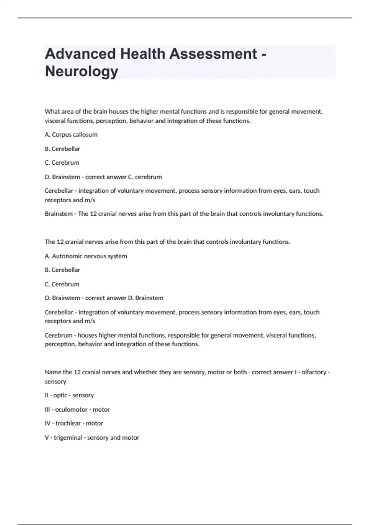 Advanced Health Assessment - Neurology questions fully solved What area of the brain houses the higher mental functions and is responsible for general movement, visceral functions, perception, behavior and integration of these functions. A. Corpus callosum B. Cerebellar C. Cerebrum D. Brainstem - correct answer C. cerebrum Cerebellar - integration of voluntary movement, process sensory information from eyes, ears, touch receptors and m/s Brainstem - The 12 cranial nerves arise from this part of the brain that controls involuntary functions. The 12 cranial nerves arise from this part of the brain that controls involuntary functions. A. Autonomic nervous system B. Cerebellar C. Cerebrum D. Brainstem - correct answer D. Brainstem Cerebellar - integration of voluntary movement, process sensory information from eyes, ears, touch receptors and m/s Cerebrum - houses higher mental functions, responsible for general movement, visceral functions, perception, behavior and integration of these functions. Name the 12 cranial nerves and whether they are sensory, motor or both - correct answer I - olfactory - sensory II - optic - sensory III - oculomotor - motor IV - trochlear - motor V - trigeminal - sensory and motor