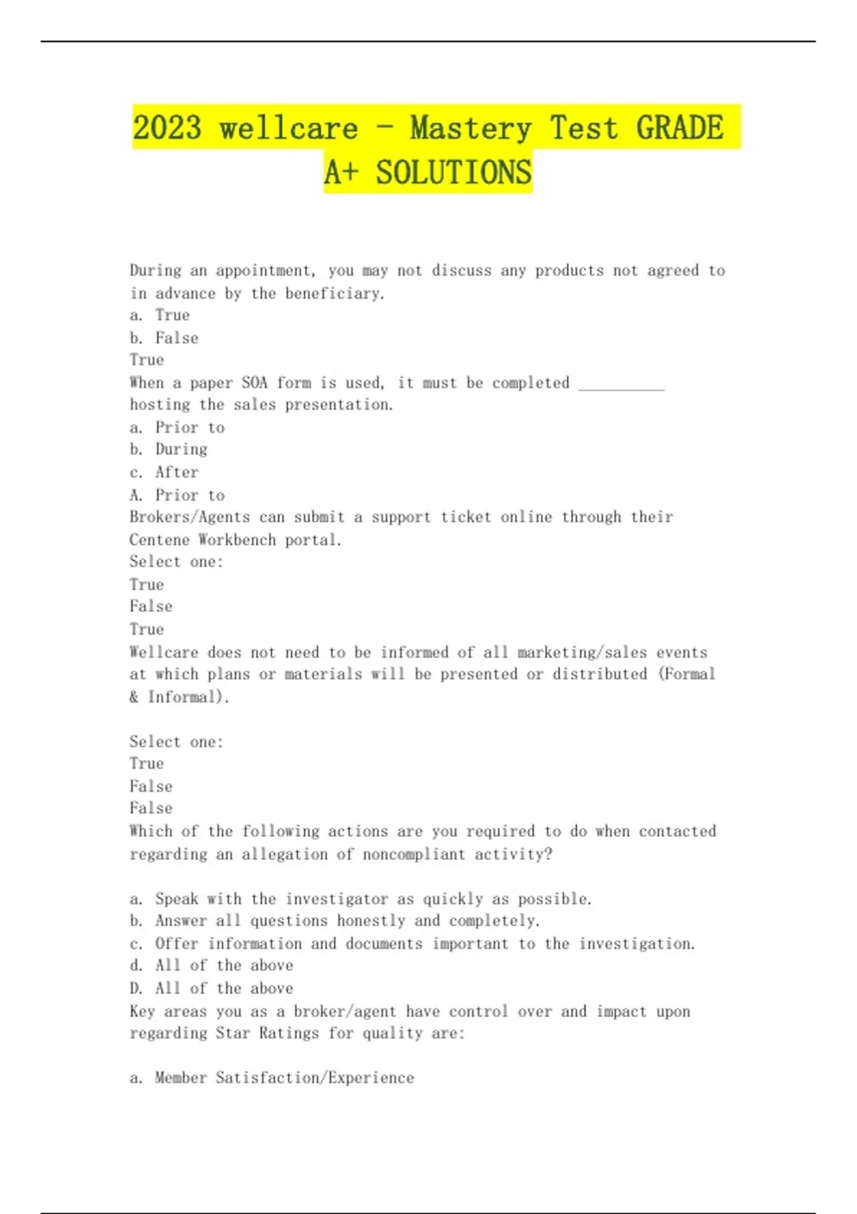 During an appointment, you may not discuss any products not agreed to in advance by the beneficiary. a. True b. False True When a paper SOA form is used, it must be completed __________ hosting the sales presentation. a. Prior to b. During c. After A. Prior to Brokers/Agents can submit a support ticket online through their Centene Workbench portal. Select one: True False True Wellcare does not need to be informed of all marketing/sales events at which plans or materials will be presented or distributed (Formal & Informal). Select one: True False False Which of the following actions are you required to do when contacted regarding an allegation of noncompliant activity? a. Speak with the investigator as quickly as possible. b. Answer all questions honestly and completely. c. Offer information and documents important to the investigation. d. All of the above D. All of the above Key areas you as a broker/agent have control over and impact upon regarding Star Ratings for quality are: a. Member Satisfaction/Experience b. Complaints c. Rapid Disenrollment d. All of the above D. All of the above Noting the correct enrollment period on enrollment applications helps in preventing delayed enrollment processing. Select one: True False True Health plan fax numbers vary for health plans that offer fax enrollment submissions. Select one: True False True Centene requires all contracted brokers/agents to read, understand, and agree to Centene's Business Ethics and Code of Conduct Policy. Select one: True False True A grievance request, or any evidence concerning a grievance, must be filed orally or in writing no later than _____ calendar days from the date of the event or the date the member is made aware of the issue. a. 30 b. 45 c. 60 d. 90 C. 60 Any request or distribution of PHI should contain only the minimum amount of PHI required to complete the intended task. Select one: True False True Beneficiary-facing content that includes generic or plan-specific product or benefit information must be submitted for review and CMS submission, as well as acceptance or approval, prior to distribution. CONTINUED......