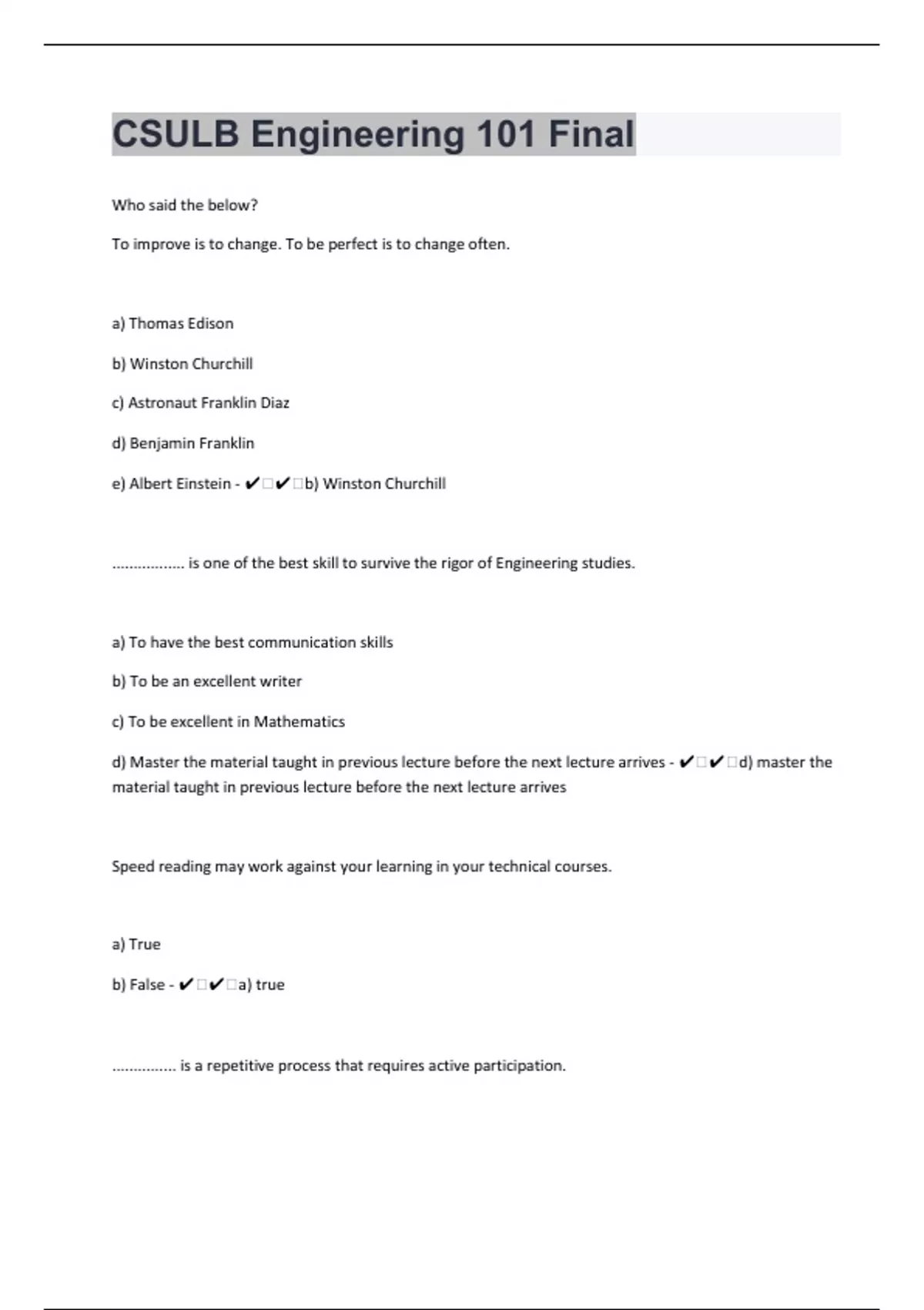 Who said the below? To improve is to change. To be perfect is to change often. a) Thomas Edison b) Winston Churchill c) Astronaut Franklin Diaz d) Benjamin Franklin e) Albert Einstein - ️️b) Winston Churchill ................. is one of the best skill to survive the rigor of Engineering studies. a) To have the best communication skills b) To be an excellent writer c) To be excellent in Mathematics d) Master the material taught in previous lecture before the next lecture arrives - ️️d) master the material taught in previous lecture before the next lecture arrives Speed reading may work against your learning in your technical courses. a) True b) False - ️️a) true ............... is a repetitive process that requires active participation.