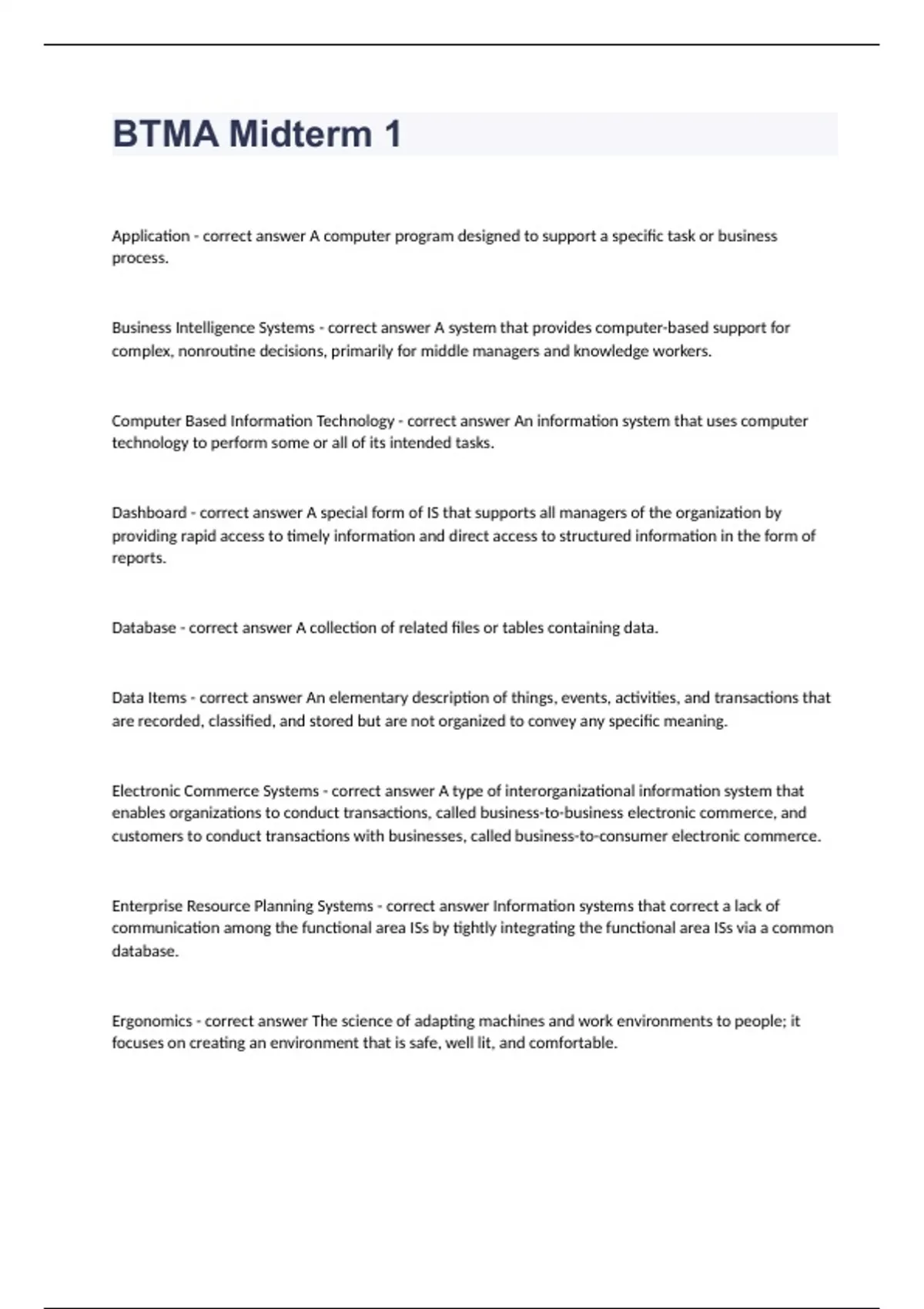 BTMA Midterm 1 questions with correct answers graded A+Application - correct answer A computer program designed to support a specific task or business process. Business Intelligence Systems - correct answer A system that provides computer-based support for complex, nonroutine decisions, primarily for middle managers and knowledge workers. Computer Based Information Technology - correct answer An information system that uses computer technology to perform some or all of its intended tasks. Dashboard - correct answer A special form of IS that supports all managers of the organization by providing rapid access to timely information and direct access to structured information in the form of reports. Database - correct answer A collection of related files or tables containing data. Data Items - correct answer An elementary description of things, events, activities, and transactions that are recorded, classified, and stored but are not organized to convey any specific meaning. Electronic Commerce Systems - correct answer A type of interorganizational information system that enables organizations to conduct transactions, called business-to-business electronic commerce, and customers to conduct transactions with businesses, called business-to-consumer electronic commerce. Enterprise Resource Planning Systems - correct answer Information systems that correct a lack of communication among the functional area ISs by tightly integrating the functional area ISs via a common