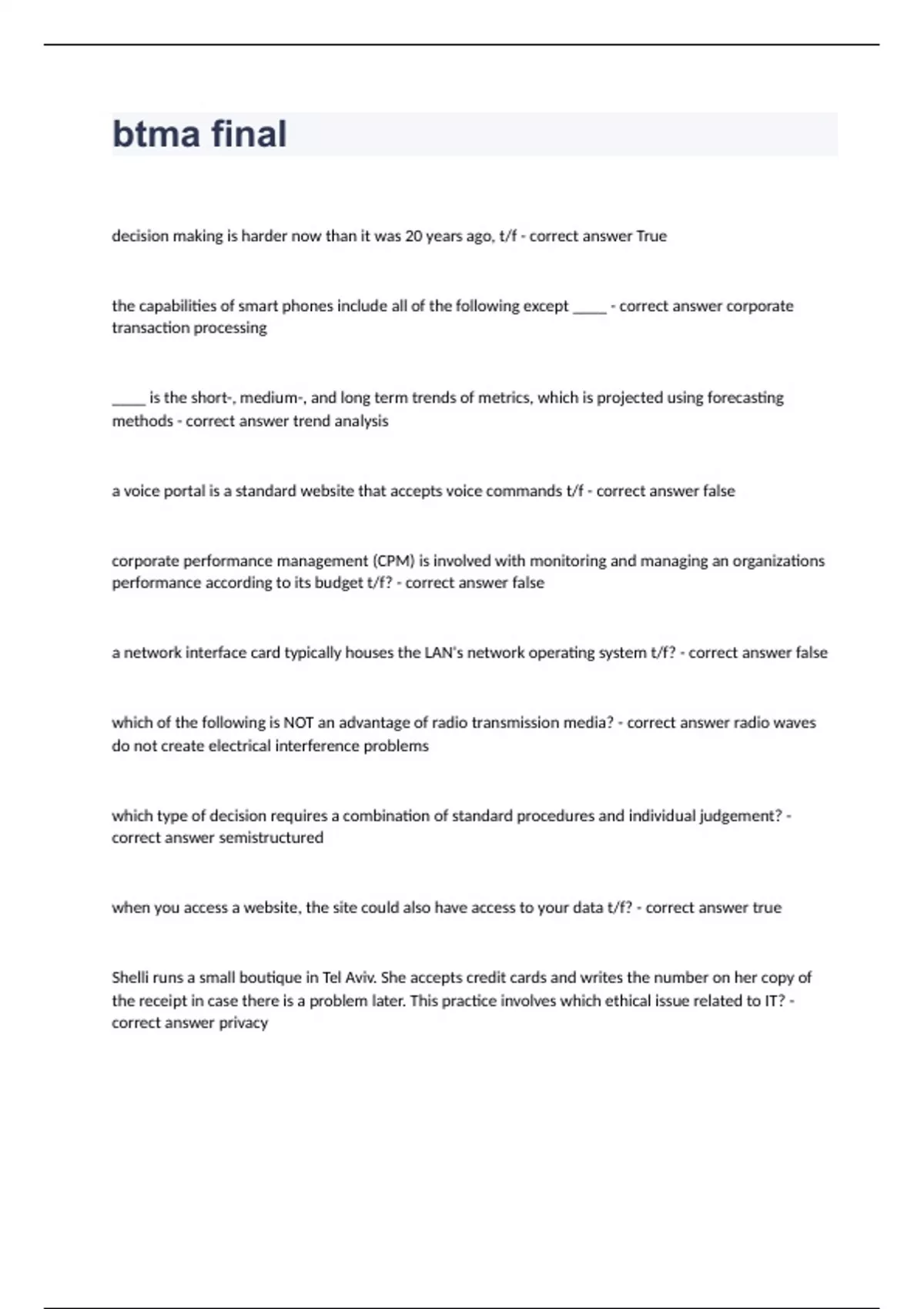 BTMA final questions with 100% correct answers graded A+decision making is harder now than it was 20 years ago, t/f - correct answer True the capabilities of smart phones include all of the following except ____ - correct answer corporate transaction processing ____ is the short-, medium-, and long term trends of metrics, which is projected using forecasting methods - correct answer trend analysis a voice portal is a standard website that accepts voice commands t/f - correct answer false corporate performance management (CPM) is involved with monitoring and managing an organizations performance according to its budget t/f? - correct answer false a network interface card typically houses the LAN's network operating system t/f? - correct answer false which of the following is NOT an advantage of radio transmission media? - correct answer radio waves do not create electrical interference problems which type of decision requires a combination of standard procedures and individual judgement? - correct answer semistructured when you access a website, the site could also have access to your data t/f? - correct answer true Shelli runs a small boutique in Tel Aviv. She accepts credit cards and writes the number on her copy of the receipt in case there is a problem later. This practice involves which ethical issue related to IT? - correct answer privacy