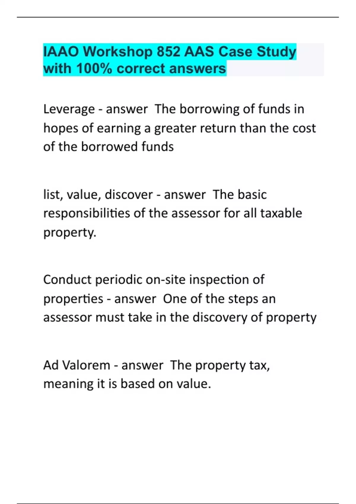 IAAO Workshop 852 AAS Case Study with 100% correct answers