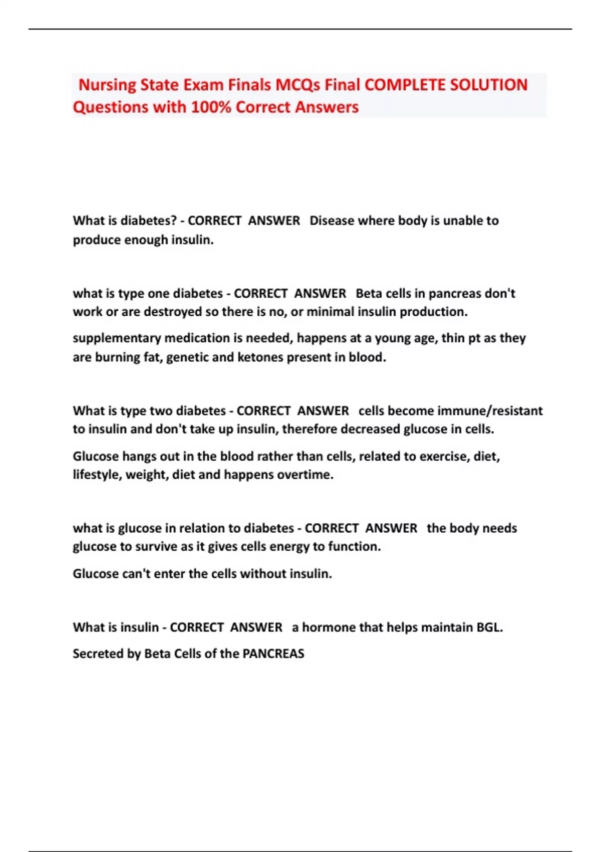 Nursing State Exam Finals MCQs Final COMPLETE SOLUTION Questions with 100% Correct Answers What is diabetes? - CORRECT ANSWER Disease where body is unable to produce enough insulin. what is type one diabetes - CORRECT ANSWER Beta cells in pancreas don't work or are destroyed so there is no, or minimal insulin production. supplementary medication is needed, happens at a young age, thin pt as they are burning fat, genetic and ketones present in blood. What is type two diabetes - CORRECT ANSWER cells become immune/resistant to insulin and don't take up insulin, therefore decreased glucose in cells. Glucose hangs out in the blood rather than cells, related to exercise, diet, lifestyle, weight, diet and happens overtime. what is glucose in relation to diabetes - CORRECT ANSWER the body needs glucose to survive as it gives cells energy to function. Glucose can't enter the cells without insulin. What is insulin - CORRECT ANSWER a hormone that helps maintain BGL. Secreted by Beta Cells of the PANCREAS What is glucagon? - CORRECT ANSWER A hormone secreted by pancreas when BGL is low. This secretion causes liver to turn glycogen to glucose. What are the symptoms of T1DM and T2DM? - CORRECT ANSWER S -- Slow Wound Healing Bl-U-rry Vision G -- Glycosuria A -- Acetone breath R -- Rashes on skin