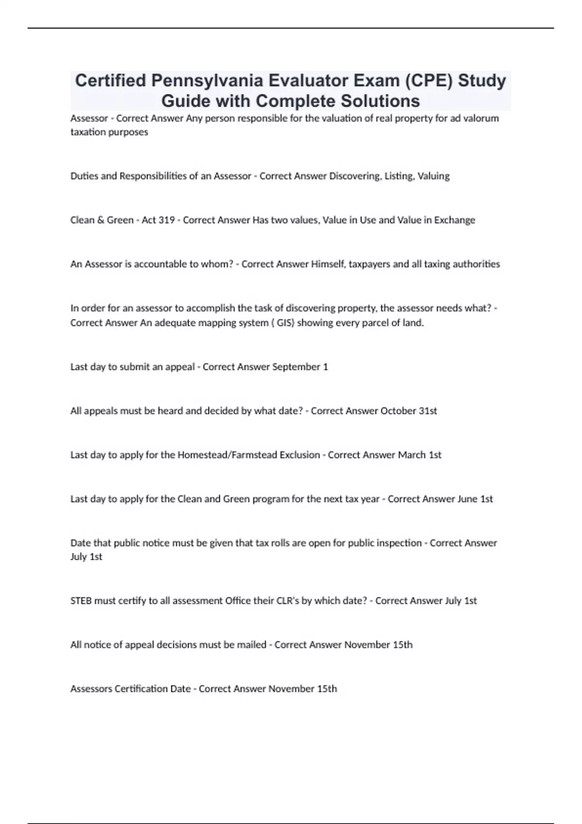 Certified Pennsylvania Evaluator Exam (CPE) Study Guide with Complete Solutions Assessor - Correct Answer Any person responsible for the valuation of real property for ad valorum taxation purposes Duties and Responsibilities of an Assessor - Correct Answer Discovering, Listing, Valuing Clean & Green - Act 319 - Correct Answer Has two values, Value in Use and Value in Exchange An Assessor is accountable to whom? - Correct Answer Himself, taxpayers and all taxing authorities In order for an assessor to accomplish the task of discovering property, the assessor needs what? - Correct Answer An adequate mapping system ( GIS) showing every parcel of land. Last day to submit an appeal - Correct Answer September 1 All appeals must be heard and decided by what date? - Correct Answer October 31st Last day to apply for the Homestead/Farmstead Exclusion - Correct Answer March 1st Last day to apply for the Clean and Green program for the next tax year - Correct Answer June 1st Date that public notice must be given that tax rolls are open for public inspection - Correct Answer July 1st STEB must certify to all assessment Office their CLR's by which date? - Correct Answer July 1st All notice of appeal decisions must be mailed - Correct Answer November 15th Assessors Certification Date - Correct Answer November 15th Levels of appeal process - Correct Answer 1. County Board of Assessment Appeals, 2. Court of Common Pleas of Pennsylvania, 3.Commonwealth Court of Pennsylvania, 4.Superior Court of Pennsylvania Assessors are charged with the responsibility of administering what? - Correct Answer A uniform and equitable assessment system March 17th 1987 - Correct Answer The Assessors Certification Act required that all persons respo