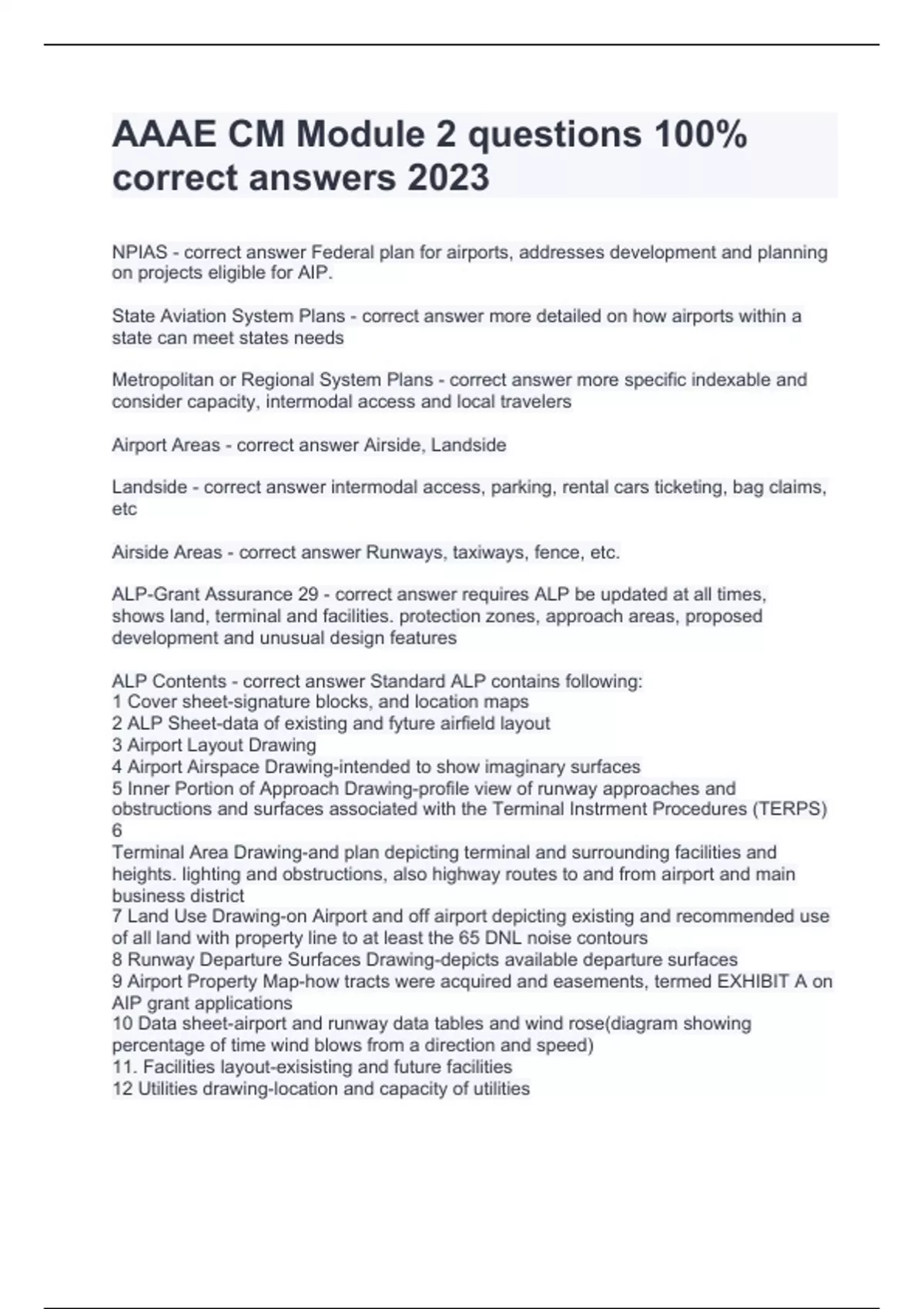 AAAE CM Module 2 questions 100% correct answers 2023/2024NPIAS - correct answer Federal plan for airports, addresses development and planning on projects eligible for AIP. State Aviation System Plans - correct answer more detailed on how airports within a state can meet states needs Metropolitan or Regional System Plans - correct answer more specific indexable and consider capacity, intermodal access and local travelers Airport Areas - correct answer Airside, Landside Landside - correct answer intermodal access, parking, rental cars ticketing, bag claims, etc Airside Areas - correct answer Runways, taxiways, fence, etc. ALP-Grant Assurance 29 - correct answer requires ALP be updated at all times, shows land, terminal and facilities. protection zones, approach areas, proposed development and unusual design features ALP Contents - correct answer Standard ALP contains following: 1 Cover sheet-signature blocks, and location maps 2 ALP Sheet-data of existing and fyture airfield layout 3 Airport Layout Drawing 4 Airport Airspace Drawing-intended to show imaginary surfaces 5 Inner Portion of Approach Drawing-profile view of runway approaches and obstructions and surfaces associated with the Terminal Instrment Procedures (TERPS) 6 Terminal Area Drawing-and plan depicting terminal and surrounding facilities and heights. lighting and obstructions, also highway routes to and from airport and main business district 7 Land Use Drawing-on Airport and off airport depicting existing and recommended use of all land with property line to at least the 65 DNL noise contours 8 Runway Departure Surfaces Drawing-depicts available departure surfaces