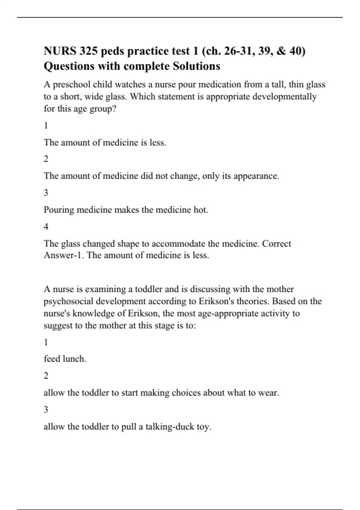 A preschool child watches a nurse pour medication from a tall, thin glass to a short, wide glass. Which statement is appropriate developmentally for this age group? 1 The amount of medicine is less. 2 The amount of medicine did not change, only its appearance. 3 Pouring medicine makes the medicine hot. 4 The glass changed shape to accommodate the medicine. Correct Answer-1. The amount of medicine is less. A nurse is examining a toddler and is discussing with the mother psychosocial development according to Erikson's theories. Based on the nurse's knowledge of Erikson, the most age-appropriate activity to suggest to the mother at this stage is to: 1 feed lunch. 2 allow the toddler to start making choices about what to wear. 3 allow the toddler to pull a talking-duck