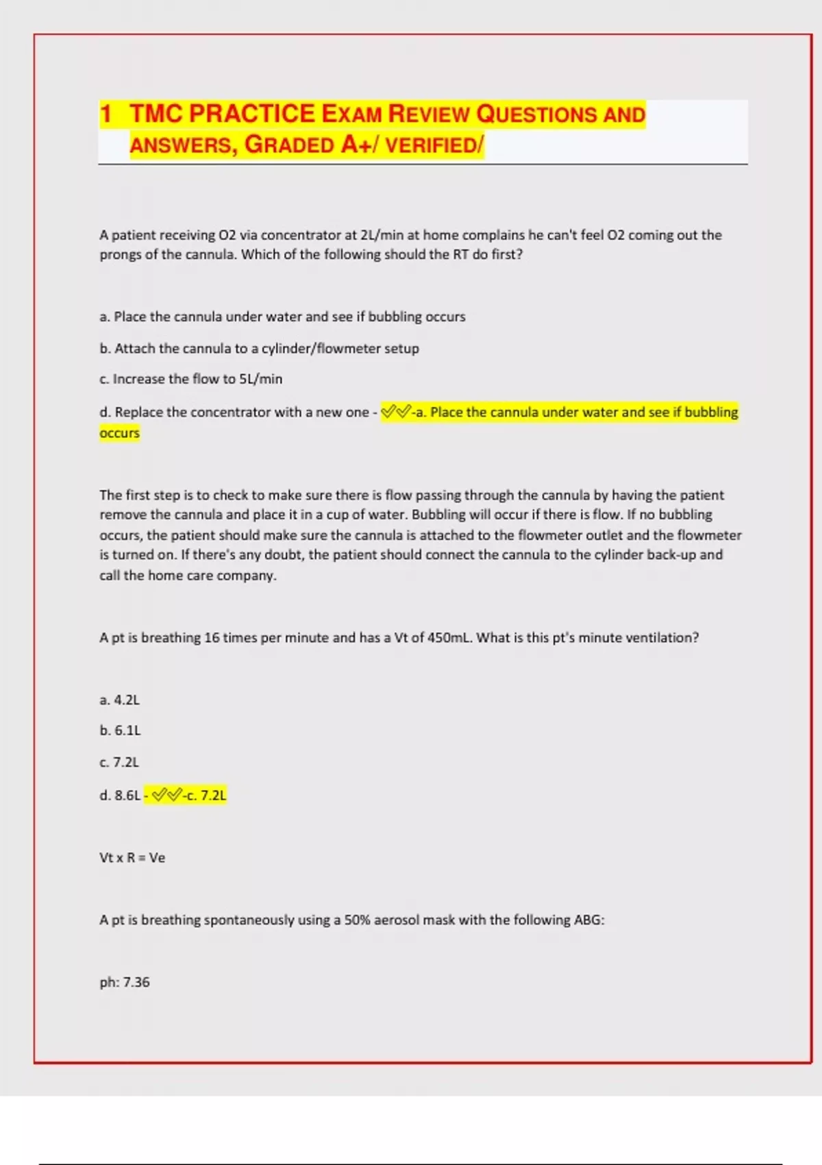 TMC PRACTICE EXAM REVIEW QUESTIONS AND ANSWERS, GRADED A+/ VERIFIED/ A patient receiving O2 via concentrator at 2L/min at home complains he can't feel O2 coming out the prongs of the cannula. Which of the following should the RT do first? a. Place the cannula under water and see if bubbling occurs b. Attach the cannula to a cylinder/flowmeter setup c. Increase the flow to 5L/min d. Replace the concentrator with a new one - -a. Place the cannula under water and see if bubbling occurs The first step is to check to make sure there is flow passing through the cannula by having the patient remove the cannula and place it in a cup of water. Bubbling will occur if there is flow. If no bubbling occurs, the patient should make sure the cannula is attached to the flowmeter outlet and the flowmeter is turned on. If there's any doubt, the patient should connect the cannula to the cylinder back-up and call the home care company. A pt is breathing 16 times per minute and has a Vt of 450mL. What is this pt's minute ventilation? a. 4.2L b. 6.1L c. 7.2L d. 8.6L - -c. 7.2L Vt x R = Ve A pt is breathing spontaneously using a 50% aerosol mask with the following ABG: ph: 7.36 CO2: 43 O2: 48 HCO3: 24 Based on this information, the most appropriate recommendation is which of the following? a. Initiate CPAP b. Increase the O2 percentage to 70% c. Change to a nonrebreathing mask d. Change to a simple O2 mask at 10L/min - -a. Initiate CPAP A PaO2 of 55 mm Hg on 50% oxygen indicates refractory hypoxemia. Increasing the FIO2 most likely won't improve the PaO2 in addition to increasing the potential for lung damage. Applying CPAP to help recruit alveoli and allow for more surface area for oxygen to be able to enter the blood is more appropriate A pt is receiving mechanical ventilation with the following settings Vt: 750 RR: 12 Mode: AC PEEP: 10 FiO2: 80% pH: 7.41 CO2: 38 O2: 174 Based on these information, what would be the appropriate ventilator settings? a. Decrease PEEP to