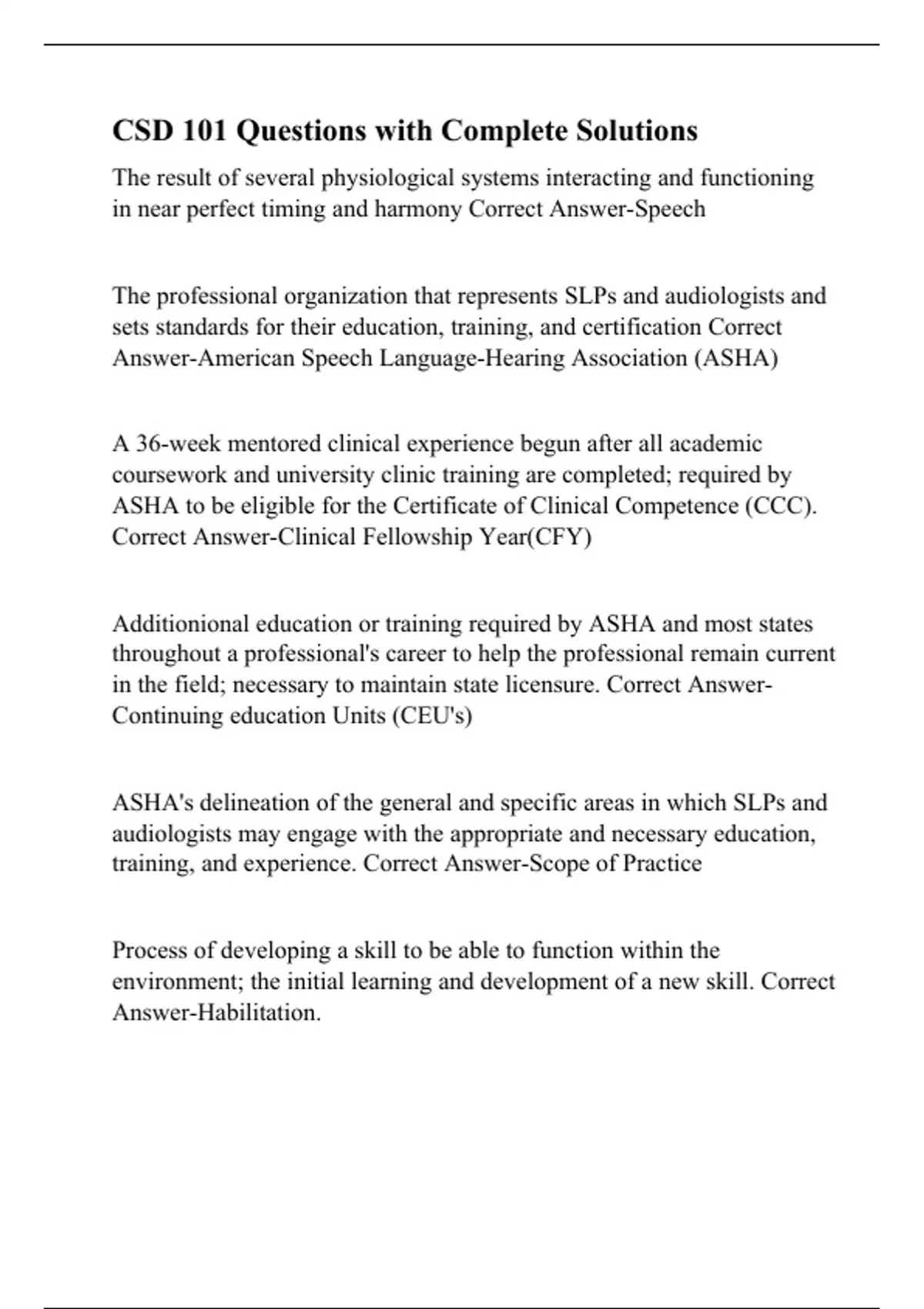 The result of several physiological systems interacting and functioning in near perfect timing and harmony Correct Answer-Speech The professional organization that represents SLPs and audiologists and sets standards for their education, training, and certification Correct Answer-American Speech Language-Hearing Association (ASHA) A 36-week mentored clinical experience begun after all academic coursework and university clinic training are completed; required by ASHA to be eligible for the Certificate of Clinical Competence (CCC). Correct Answer-Clinical Fellowship Year(CFY) Additionional education or training required by ASHA and most states throughout a professional's career to help the professional remain current in the field; necessary to maintain state licensure. Correct Answer-Continuing education Units (CEU's) ASHA's delineation of the general and specific areas in which SLPs and audiologists may engage with the appropriate and necessary education, training, and experience. Correct Answer-Scope of Practice Process of developing a skill to be able to function within the environment; the initial learning and development of a new skill. Correct Answer-Habilitation.